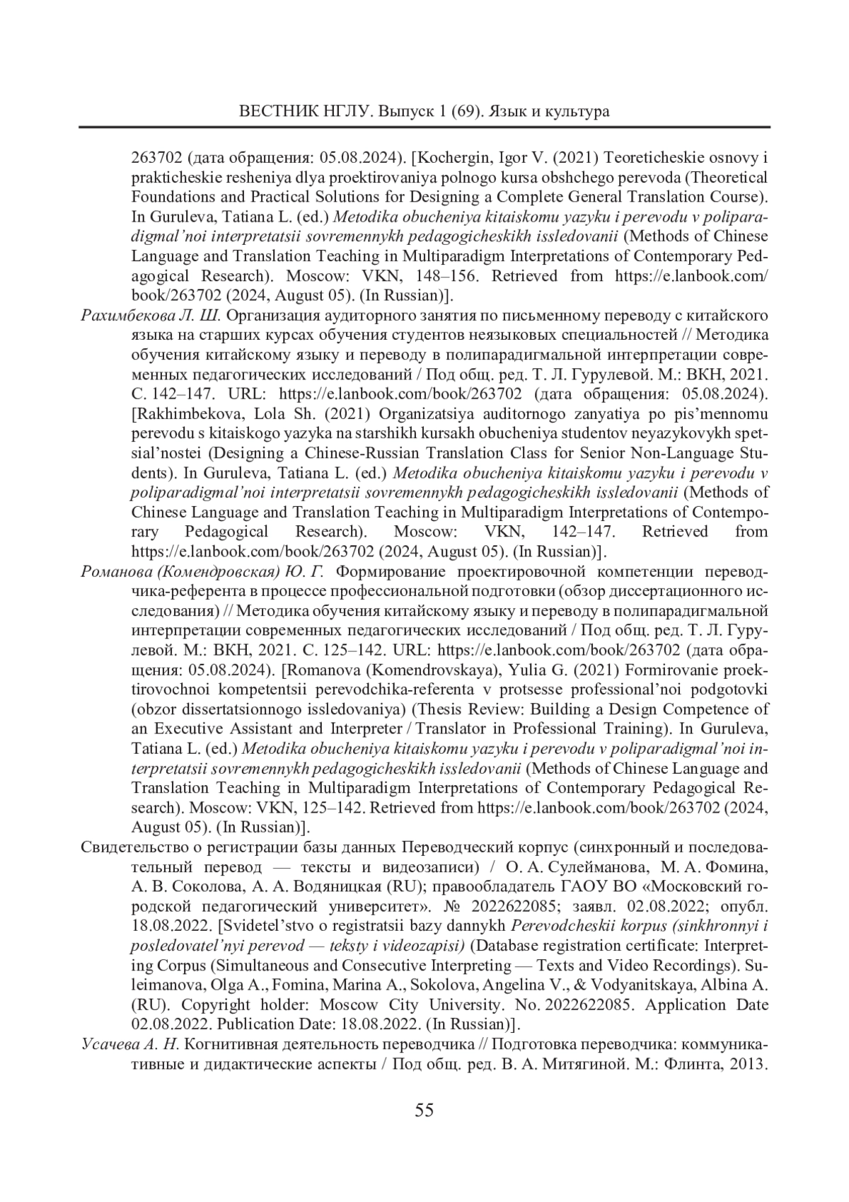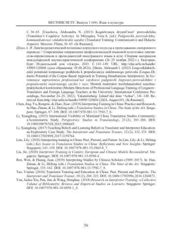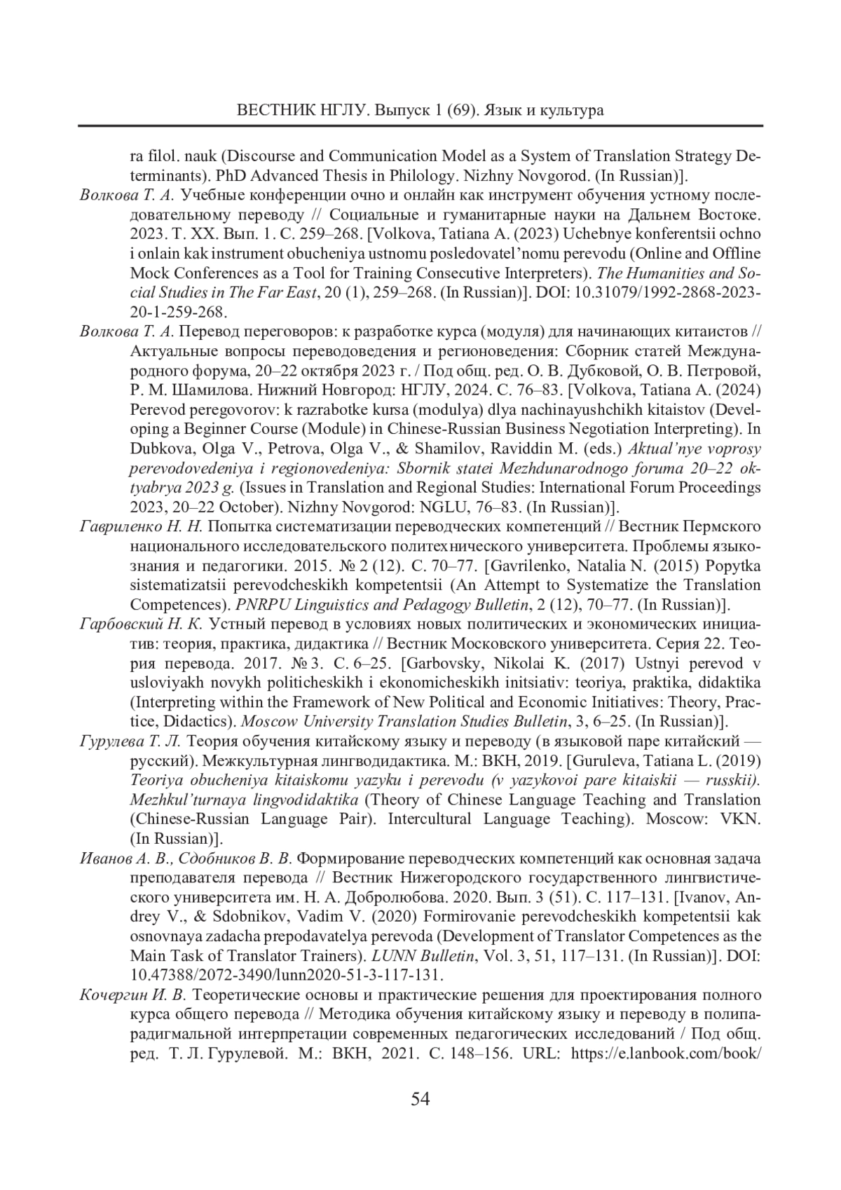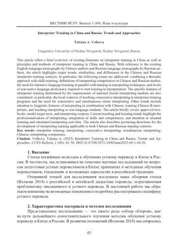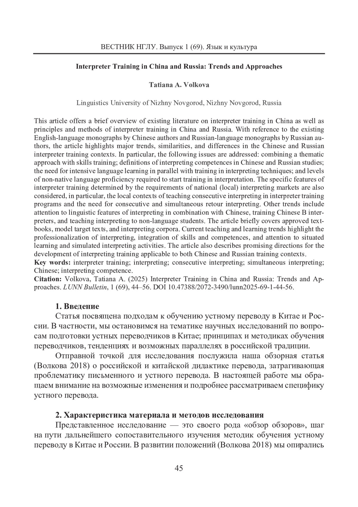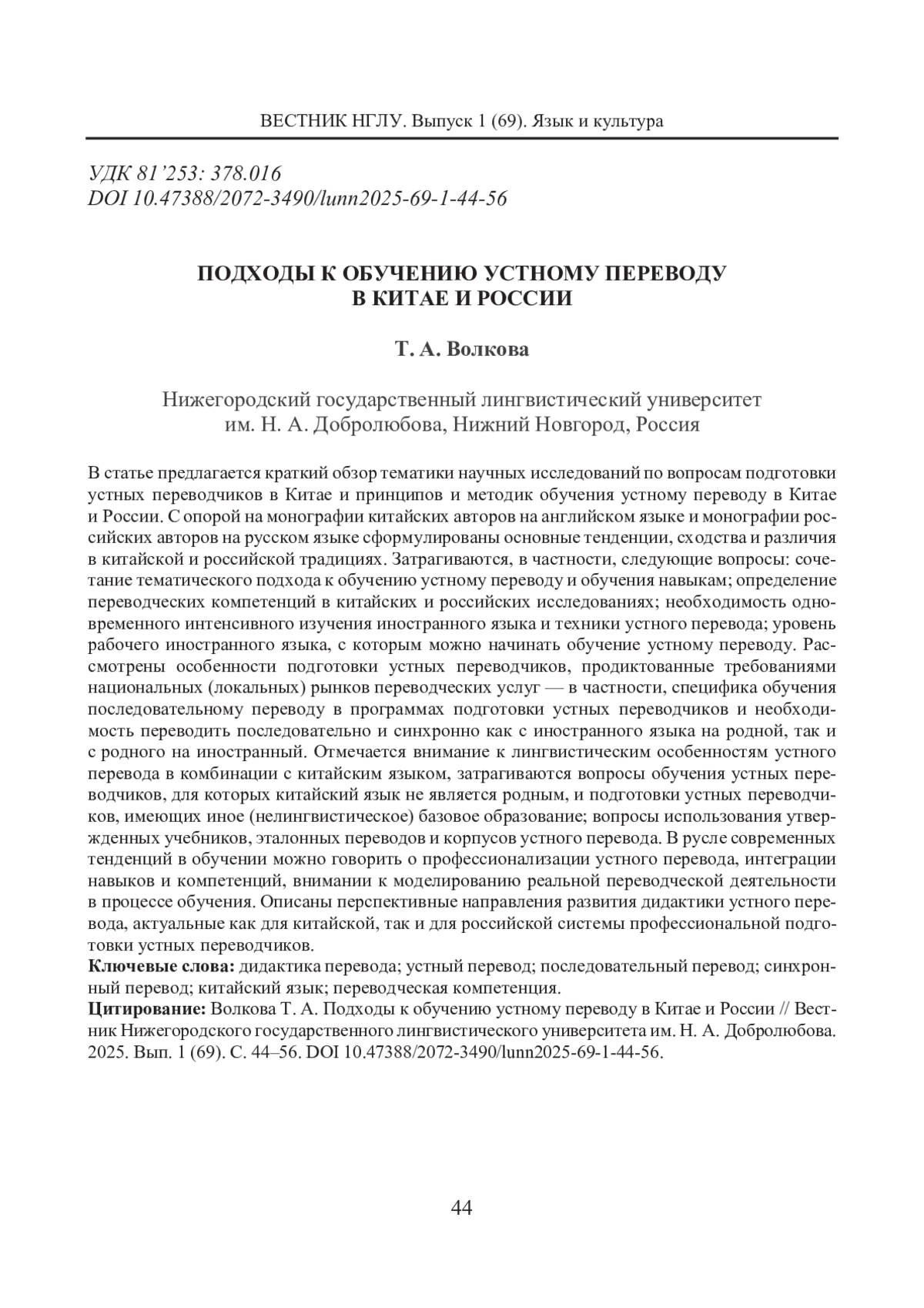 ВОЛКОВА Т. А. ПОДХОДЫ К ОБУЧЕНИЮ УСТНОМУ ПЕРЕВОДУ В КИТАЕ И РОССИИ // ВЕСТНИК НИЖЕГОРОДСКОГО ГОСУДАРСТВЕННОГО ЛИНГВИСТИЧЕСКОГО УНИВЕРСИТЕТА ИМ. Н. А. ДОБРОЛЮБОВА. 2025. № 1 (69)