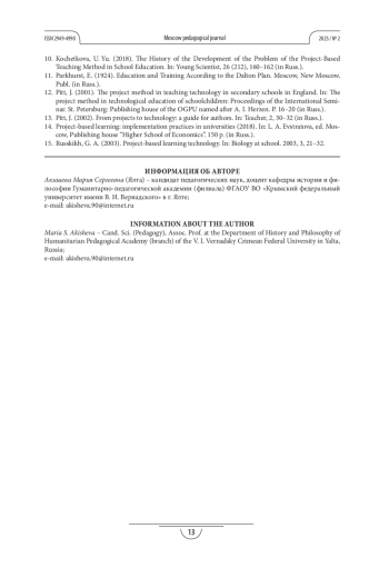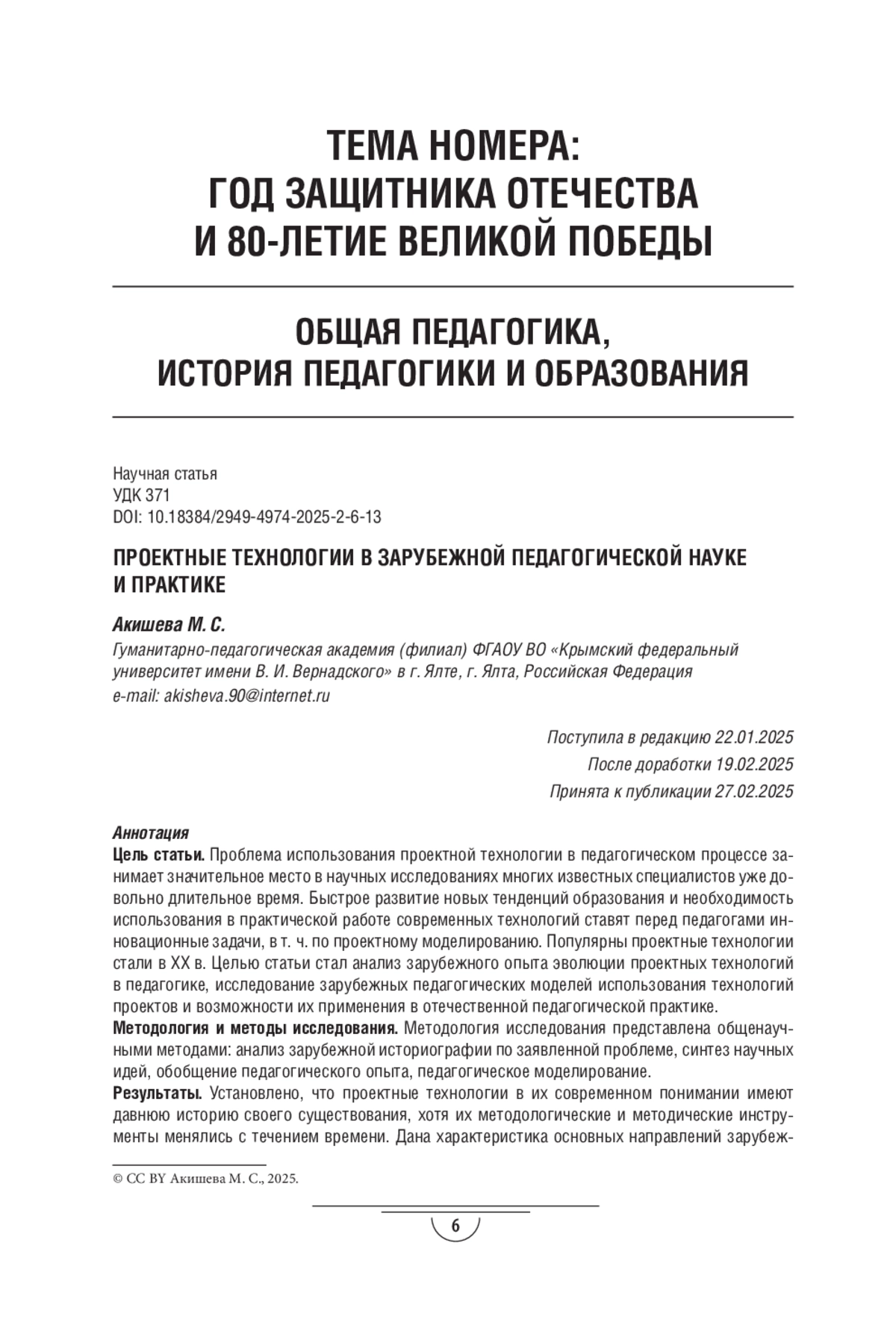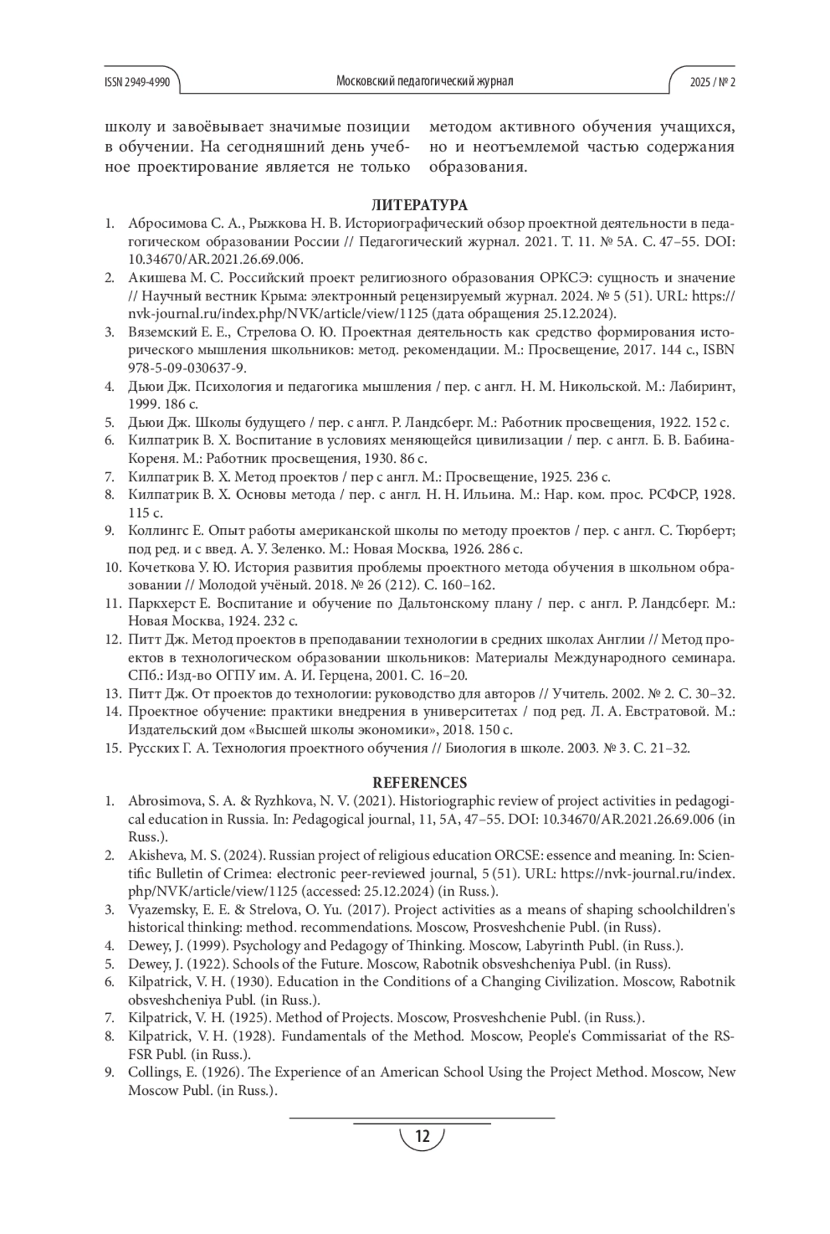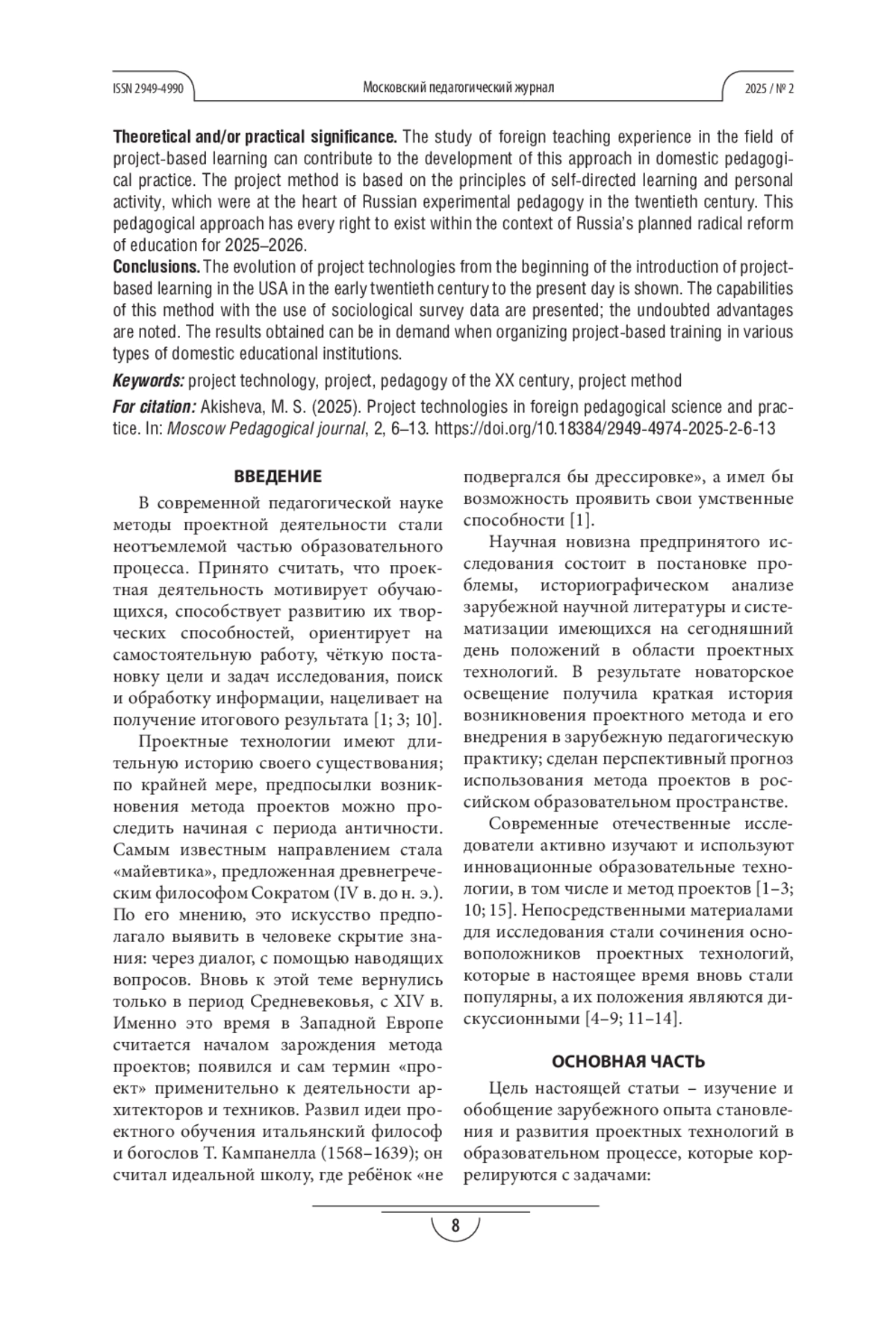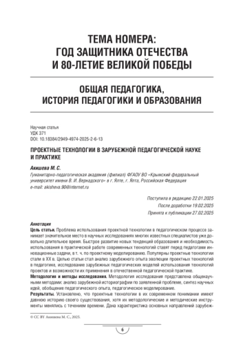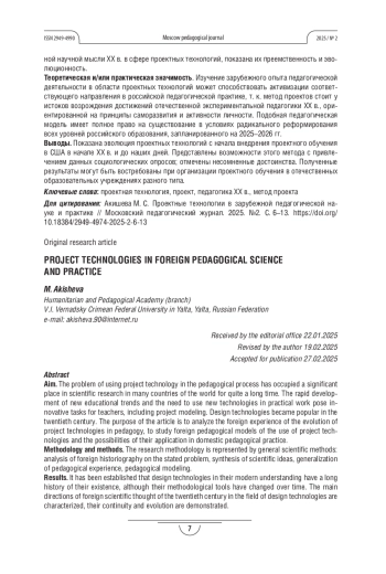 АКИШЕВА М. С. ПРОЕКТНЫЕ ТЕХНОЛОГИИ В ЗАРУБЕЖНОЙ ПЕДАГОГИЧЕСКОЙ НАУКЕ И ПРАКТИКЕ // МОСКОВСКИЙ ПЕДАГОГИЧЕСКИЙ ЖУРНАЛ. 2025. № 2