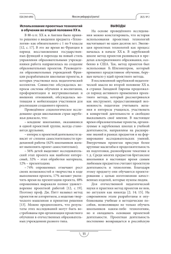 Выводы. Показана эволюция проектных технологий с начала внедрения проектного обучения в США в начале ХХ в. и до наших дней. Представлены возможности этого метода с привлечением данных социологических опросов; отмечены несомненные достоинства. Полученные результаты могут быть востребованы при организации проектного обучения в отечественных образовательных учреждениях разного типа.