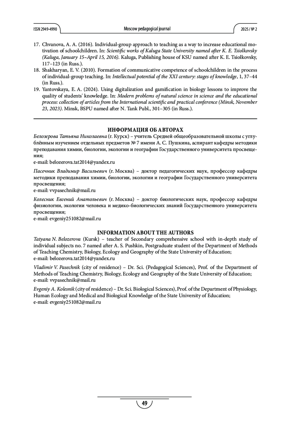 3. Белозерова Т. Н. Организация индивидуально-групповой учебно-познавательной деятельности учащихся в классах с углублённым изучением биологии // Развитие естественных наук и образования в России. Химия, биология, география, экология, образование: материалы Всероссийской научно-практической конференции памяти учёного-энциклопедиста Д. И. Менделеева (Москва, 16 февраля 2024 года). М.: ГУП, 2024. С. 191-194. EDN: PXPFBD