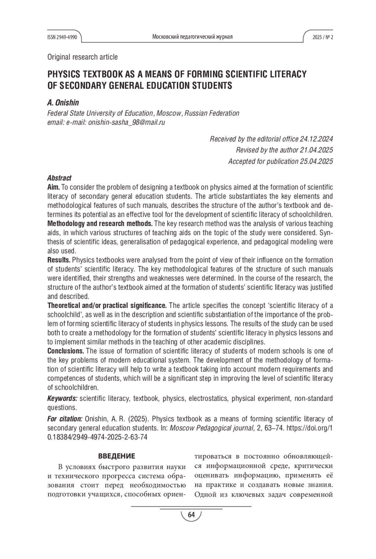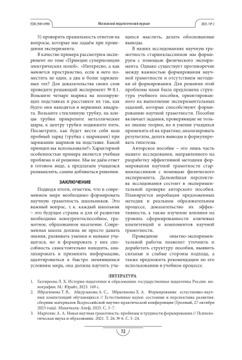 10. Холина С. А., Онишин А. Р. Роль физического эксперимента по электростатике в формировании научной грамотности обучающихся средней школы // Проблемы теории и практики инновационного развития и интеграции современной науки и образования: материалы V Международной научно-практической конференции (Москва, 14 февраля 2024 года). М.: Принтика, 2024. С. 81-84. EDN: BEEXFF