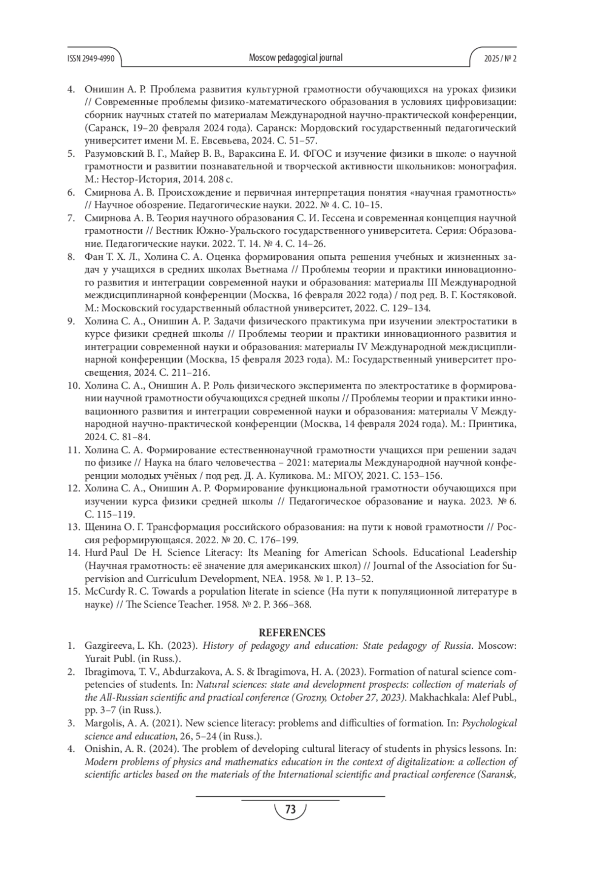 12. Холина С. А., Онишин А. Р. Формирование функциональной грамотности обучающихся при изучении курса физики средней школы // Педагогическое образование и наука. 2023. № 6. С. 115-119. EDN: LNXKIV