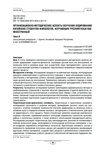 Методология и методы. Исследование базируется на комплексном подходе, интегрирующем принципы коммуникативного и деятельностного подходов, а также учитывающем психолингвистические и методические аспекты обучения аудированию студентов-филологов, изучающих русский язык как иностранный. Применялись принципы системного подхода и теории учебной деятельности. Использовались методы анкетирования преподавателей, а также количественного и качественного анализа полученных данных.