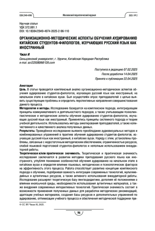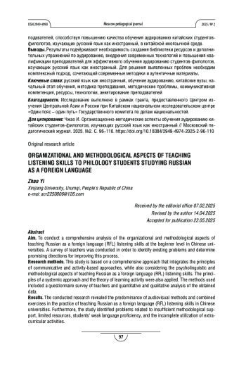 Цель. В статье проводится комплексный анализ организационно-методических аспектов обучения аудированию студентов-филологов, изучающих русский язык как иностранный, на начальном этапе в китайских вузах. Был осуществлён опрос преподавателей с целью выявить существующие проблемы и определить перспективные направления совершенствования данного процесса.
