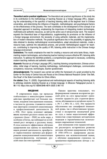 Теоретическая и/или практическая значимость. Теоретическая и практическая значимость исследования заключается в развитии методики преподавания русского языка как иностранного, углубляя понимание особенностей обучения аудированию на начальном этапе в китайских вузах и определяя влияние языковых, методических и психологических факторов на эффективность этого процесса. Работа способствует развитию концепции комплексного подхода к обучению, подчёркивая важность интеграции современных технологий, мультимедийных и аутентичных ресурсов, а также активного использования внеаудиторной работы. Исследование расширяет теоретическую базу лингводидактики, дополняя её положениями о влиянии иноязычной среды, необходимости использования аутентичных материалов, а также внедрения современных интерактивных технологий. Практическая значимость состоит в возможности применения полученных данных для разработки методических рекомендаций, адаптации учебных материалов, создания базы ресурсов и дополнительных упражнений по аудированию, оптимизации учебного процесса и обеспечения методической поддержки преподавателей, способствуя повышению качества обучения аудированию китайских студентов-филологов, изучающих русский язык как иностранный, в китайской иноязычной среде.