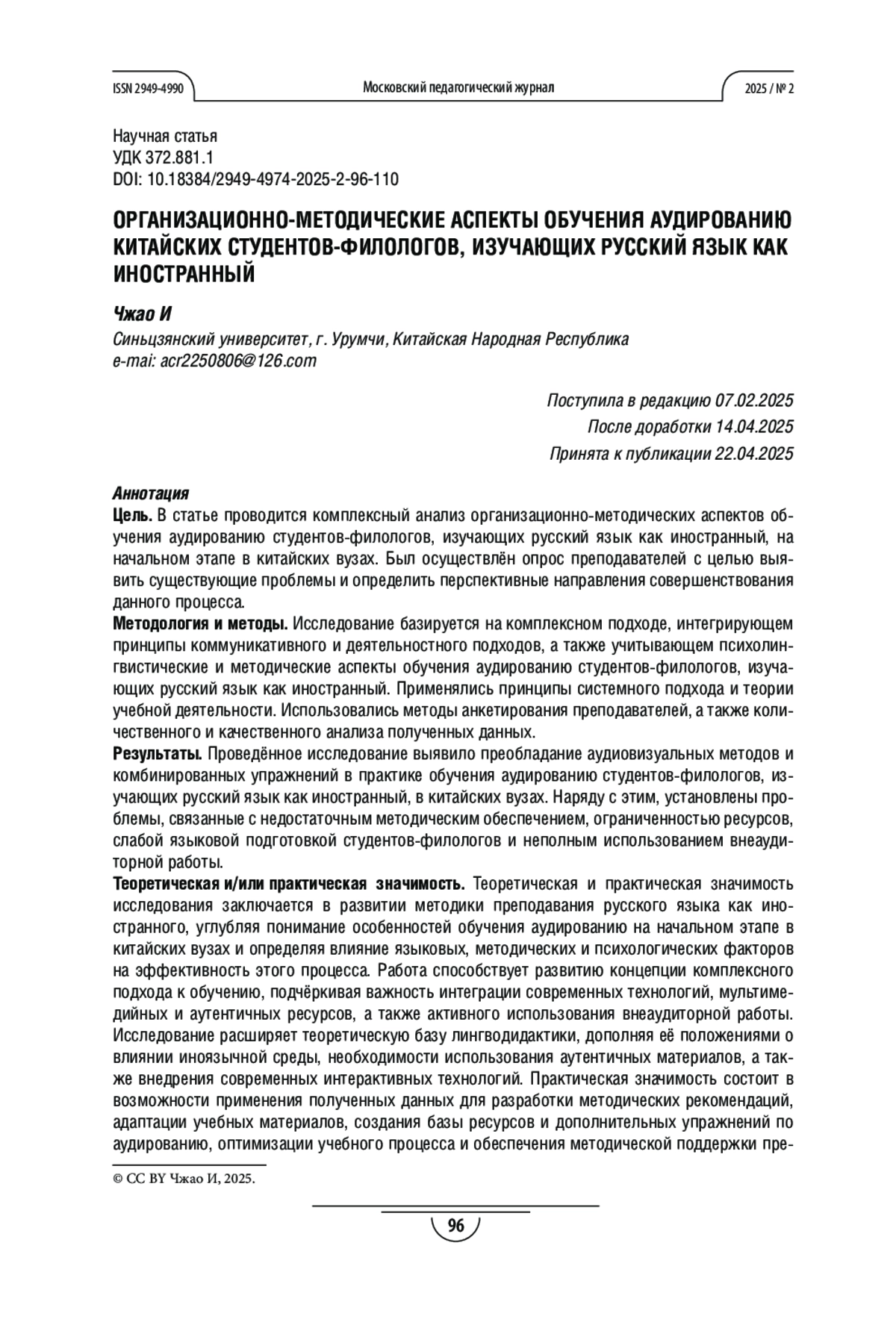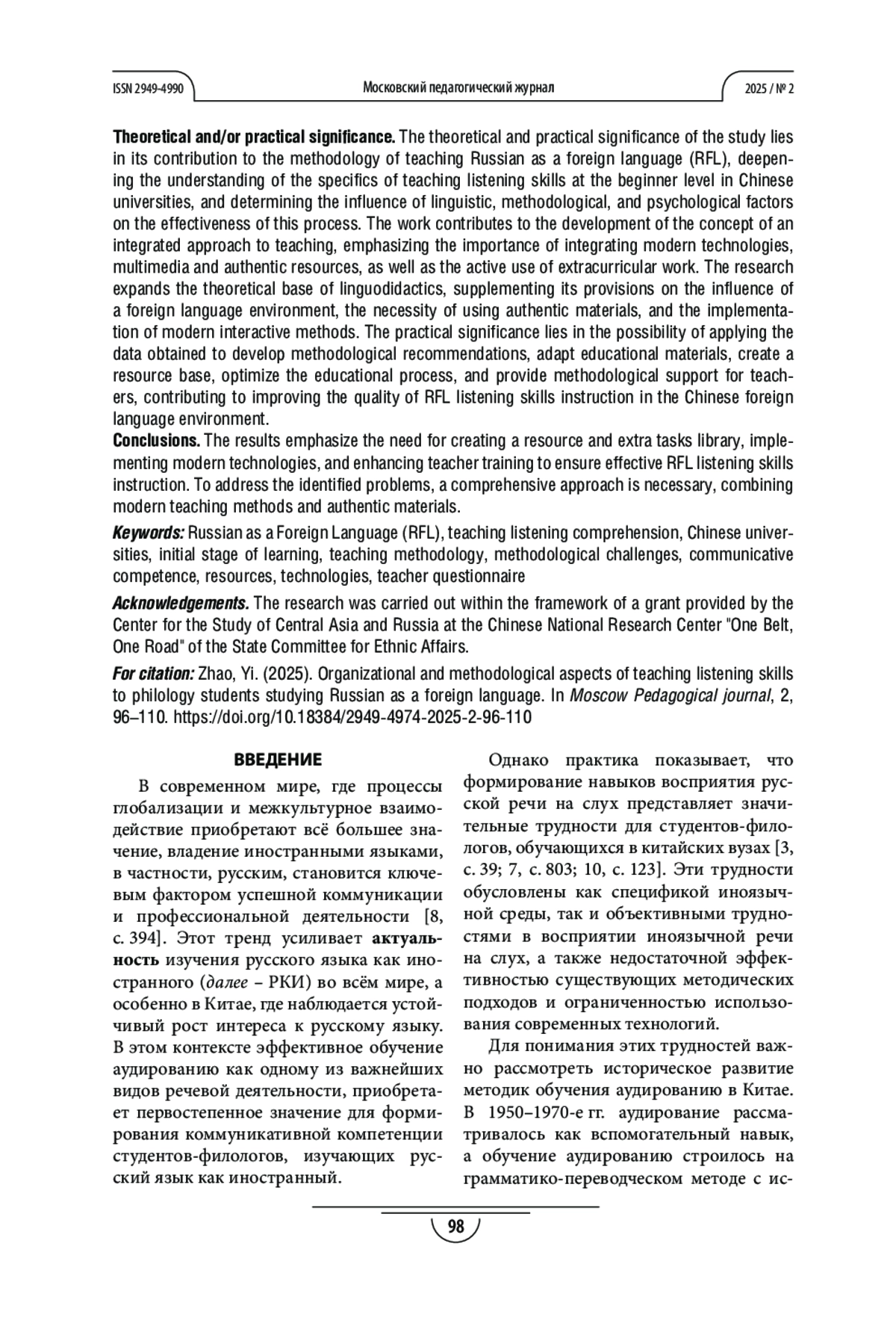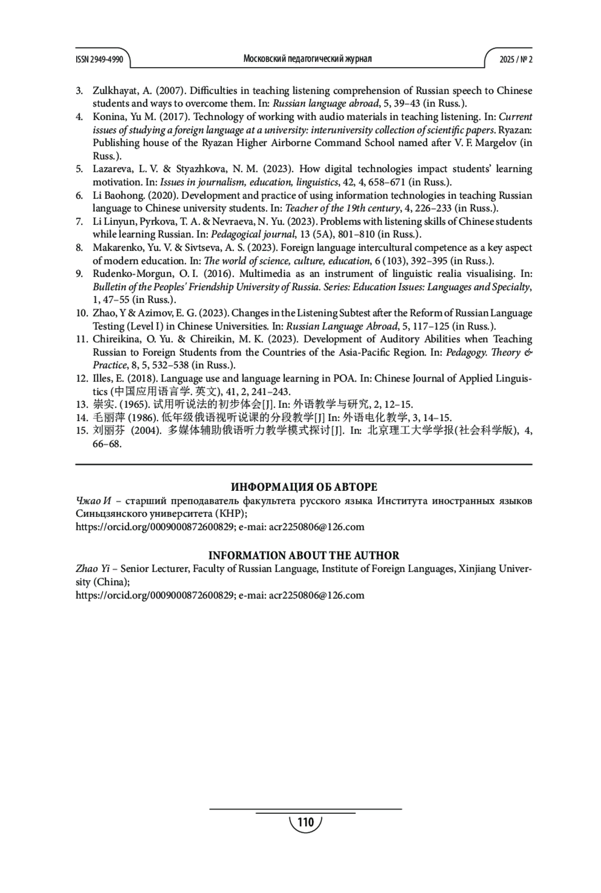 10. Чжао И, Азимов Э. Г. Изменения субтеста “аудирование” после реформы тестирования по русскому языку (I уровень) в китайских вузах // Русский язык за рубежом. 2023. № 5. С. 117-125. EDN: RIAUXC