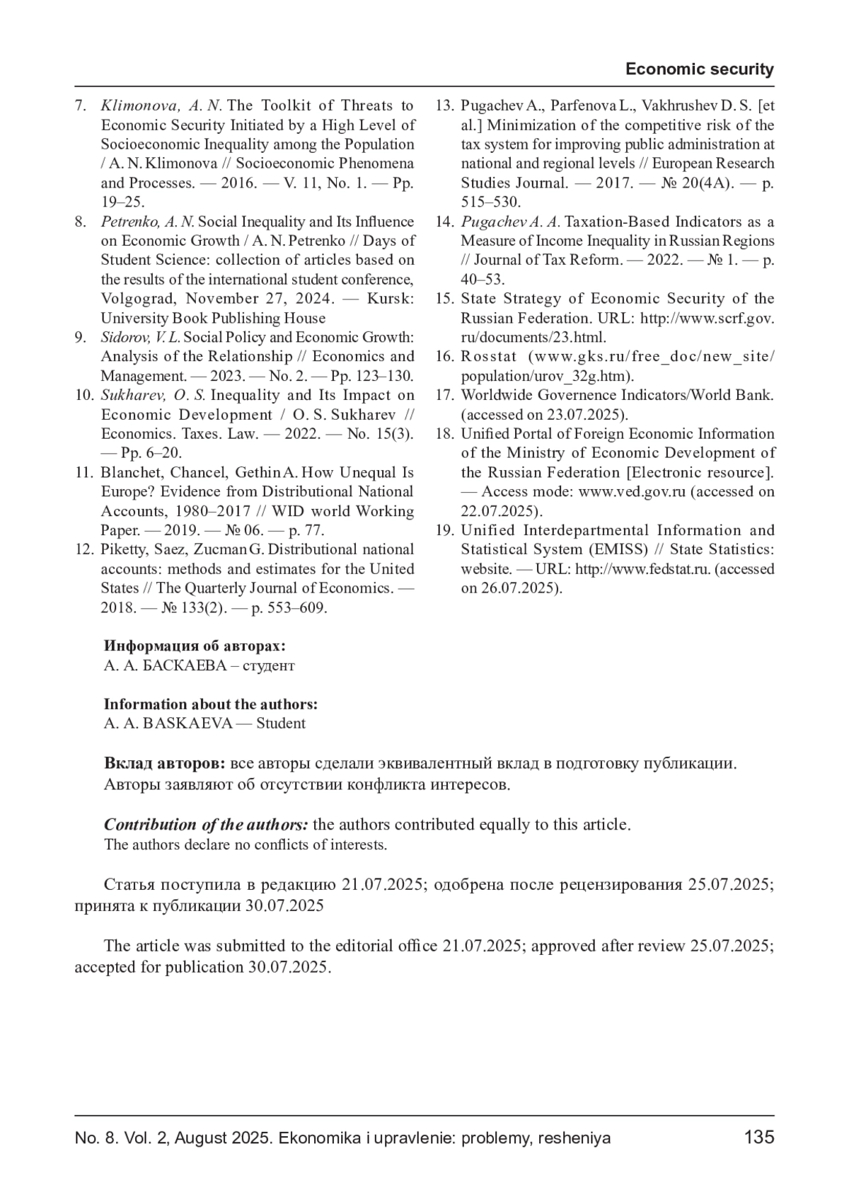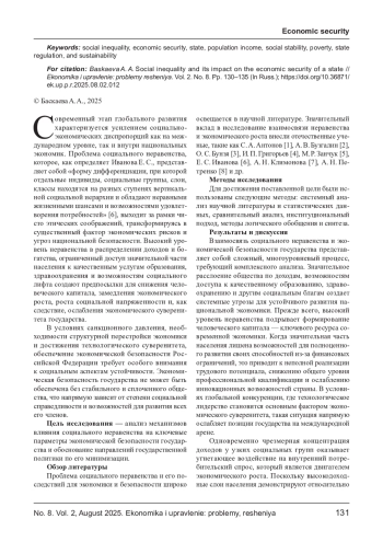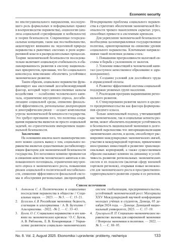 Работа подчеркивает необходимость комплексного подхода к изучению данных процессов для разработки эффективных механизмов государственного регулирования, направленных на снижение уровня неравенства и укрепление экономической безопасности. Актуальность исследования обусловлена усилением поляризации доходов в условиях глобальных экономических вызовов, цифровой трансформации и геополитической нестабильности, что требует пересмотра существующих стратегий обеспечения экономической безопасности с акцентом на социальную стабильность.
