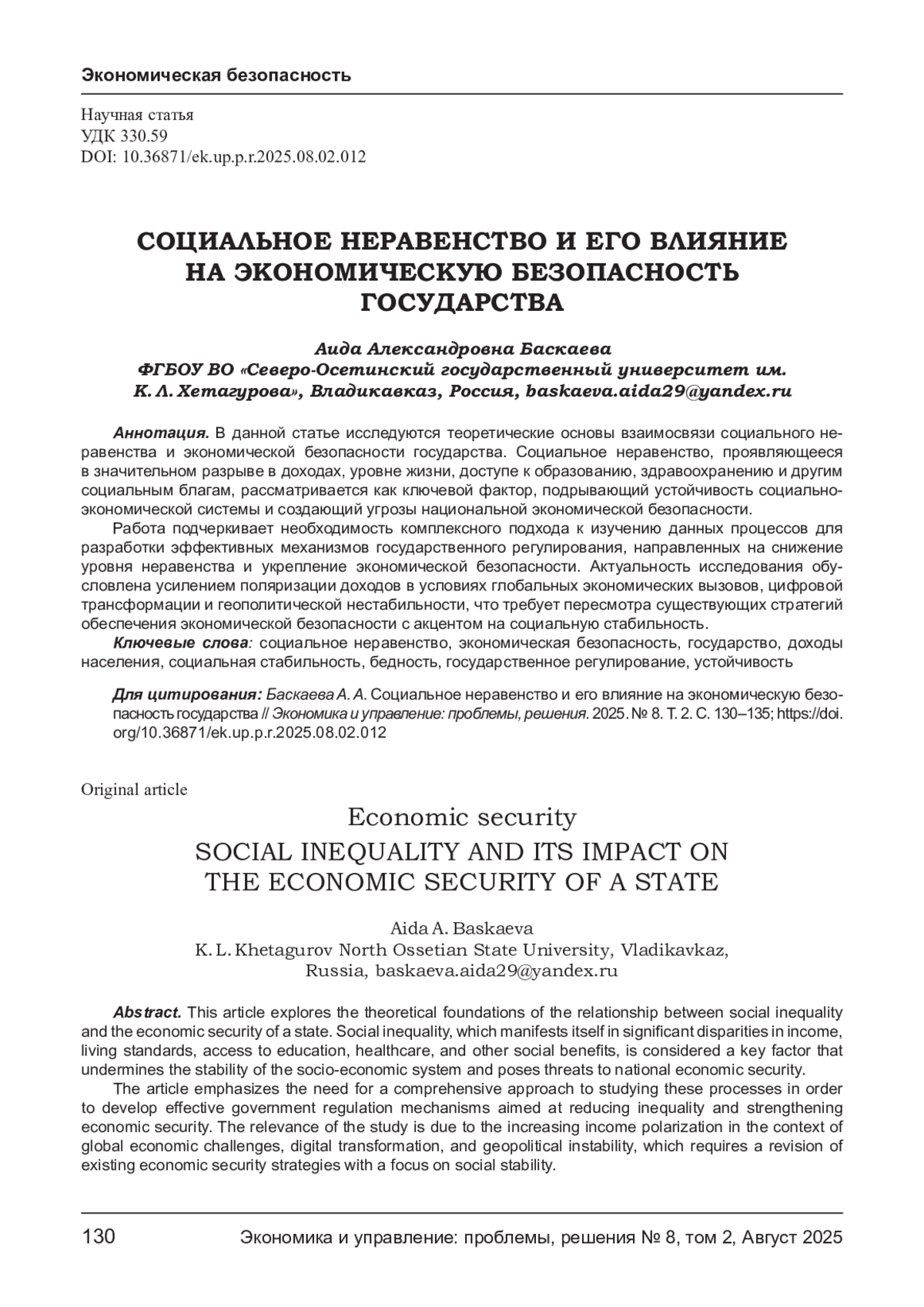 В данной статье исследуются теоретические основы взаимосвязи социального неравенства и экономической безопасности государства. Социальное неравенство, проявляющееся в значительном разрыве в доходах, уровне жизни, доступе к образованию, здравоохранению и другим социальным благам, рассматривается как ключевой фактор, подрывающий устойчивость социально- экономической системы и создающий угрозы национальной экономической безопасности.