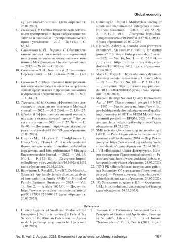 Объектом исследования выступают российские и зарубежные практики оценки эффективности МСП, особое внимание уделяется анализу международных моделей - Balanced Scorecard (BSC), модели совершенства EFQM и системы Болдриджа.