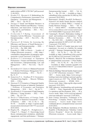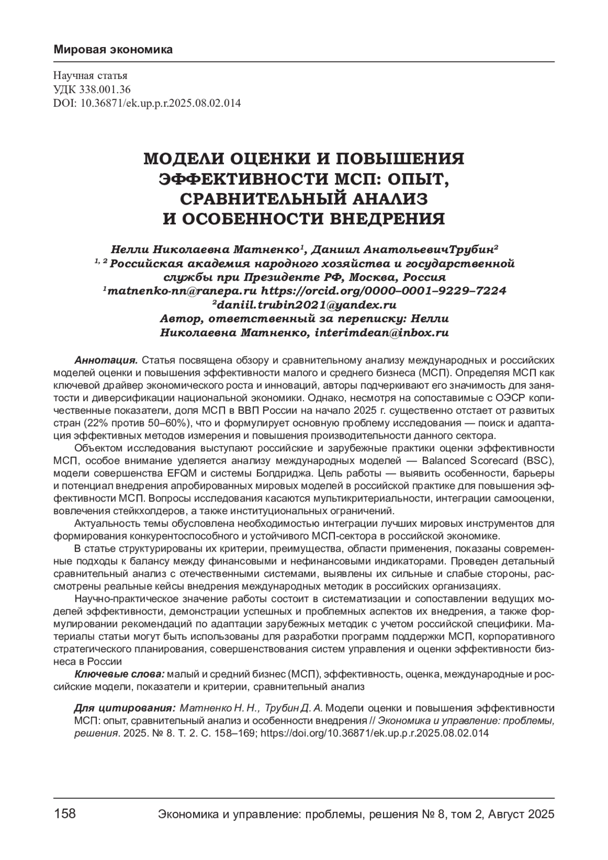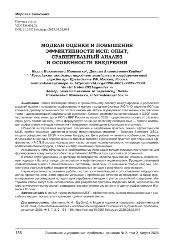 Статья посвящена обзору и сравнительному анализу международных и российских моделей оценки и повышения эффективности малого и среднего бизнеса (МСП). Определяя МСП как ключевой драйвер экономического роста и инноваций, авторы подчеркивают его значимость для занятости и диверсификации национальной экономики. Однако, несмотря на сопоставимые с ОЭСР количественные показатели, доля МСП в ВВП России на начало 2025 г. существенно отстает от развитых стран (22% против 50-60%), что и формулирует основную проблему исследования - поиск и адаптация эффективных методов измерения и повышения производительности данного сектора.