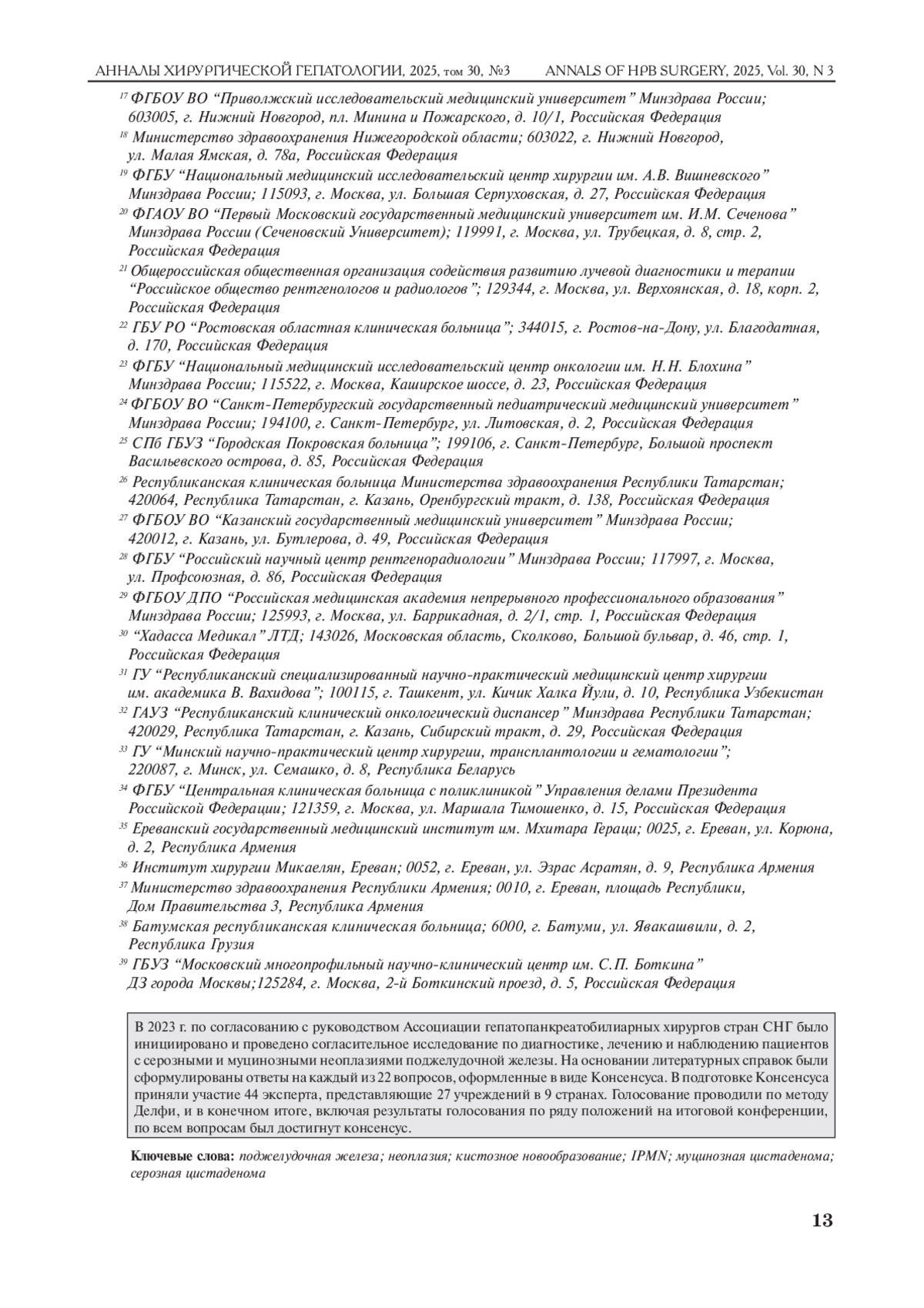В 2023 г. по согласованию с руководством Ассоциации гепатопанкреатобилиарных хирургов стран СНГ было инициировано и проведено согласительное исследование по диагностике, лечению и наблюдению пациентов с серозными и муцинозными неоплазиями поджелудочной железы. На основании литературных справок были сформулированы ответы на каждый из 22 вопросов, оформленные в виде Консенсуса. В подготовке Консенсуса приняли участие 44 эксперта, представляющие 27 учреждений в 9 странах. Голосование проводили по методу Делфи, и в конечном итоге, включая результаты голосования по ряду положений на итоговой конференции, по всем вопросам был достигнут консенсус.