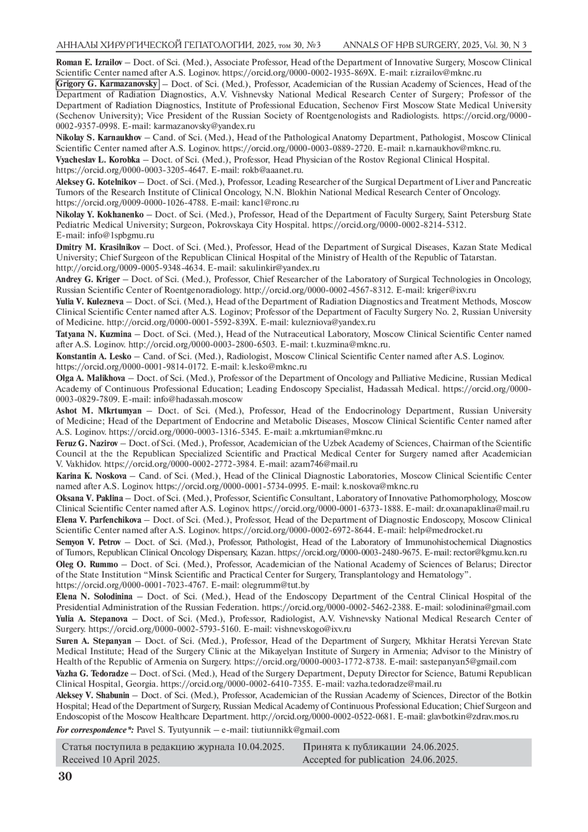 Уважаемые коллеги! По решению и при всесторонней поддержке редакции в очередном номере “Анналов хирургической гепатологии” нами подготовлен раздел, посвященный диагностике и лечению пациентов с кистозными новообразованиями поджелудочной железы. Актуальность тематики, на наш взгляд, очевидна. Улучшение доступности инструментальных методов диагностики, таких как КТ и МРТ, приводит к значительному росту выявляемости кистозных неоплазий поджелудочной железы. При этом ввиду значительной разнородности семиотики и сложностей определения прогноза при различных видах кистозных образований в профессиональном сообществе происходит множество дискуссий в части определения тактических подходов к лечению таких больных. Существующие рекомендации зачастую предлагают различную тактику, разные базовые критерии для ее выбора, что затрудняет их использование на практике. Особые сложности возникают, когда такие пациенты проходят лечение и наблюдаются в общесоматических не узкоспециализированных медицинских учреждениях.