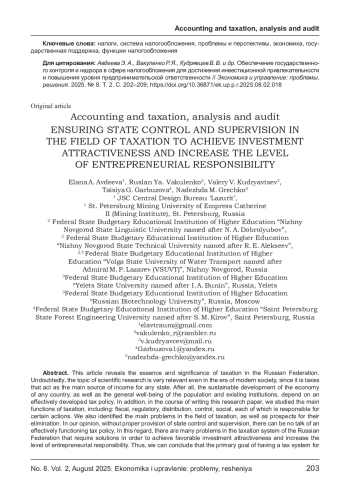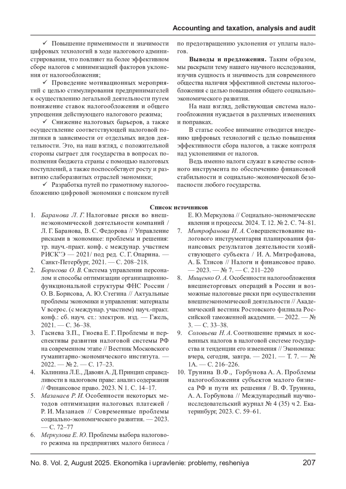 1. Баранова Л. Г. Налоговые риски во внешнеэкономической деятельности компаний / Л. Г. Баранова, В. С. Федорова // Управление рисками в экономике: проблемы и решения: тр. науч.-практ. конф. с междунар. участием РИСК’Э - 2021/ под ред. С. Г. Опарина. - Санкт- Петербург, 2021. - С. 208-218.