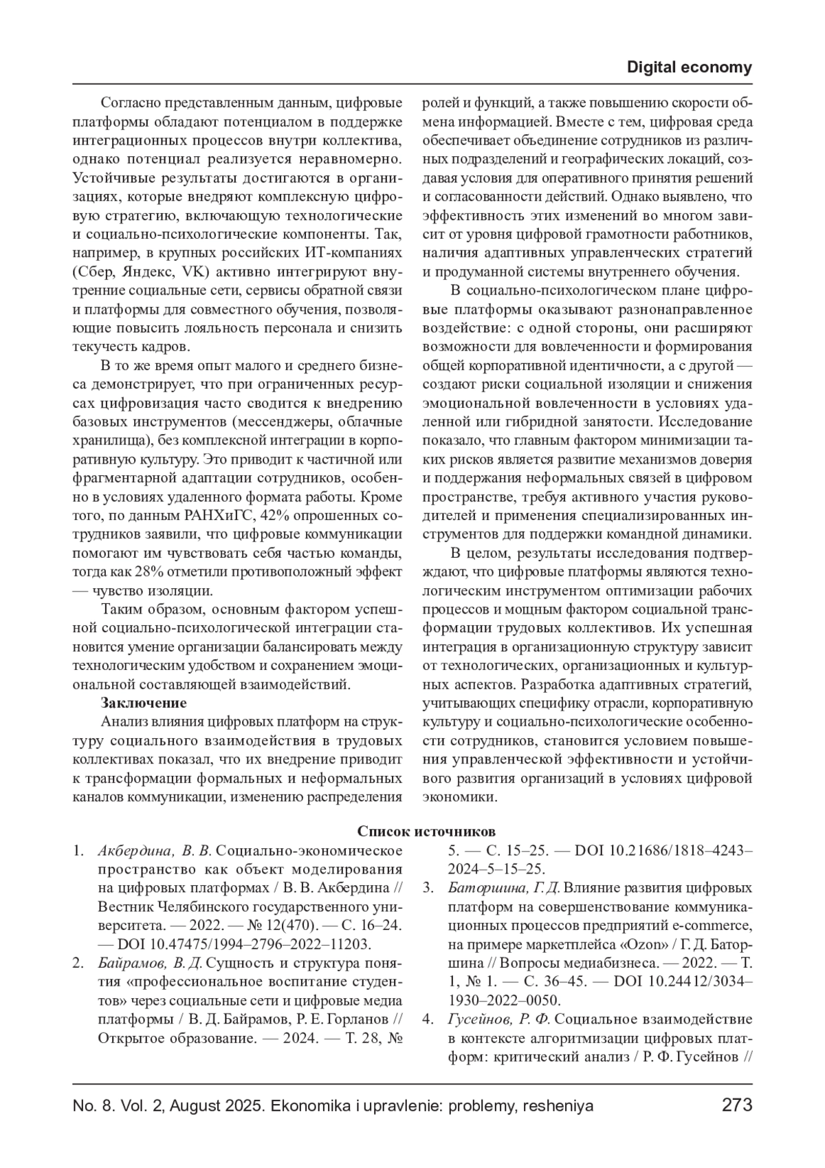1. Акбердина, В. В. Социально-экономическое пространство как объект моделирования на цифровых платформах / В. В. Акбердина // Вестник Челябинского государственного университета. - 2022. - № 12(470). - С. 16-24. DOI: 10.47475/1994-2796-2022-11203