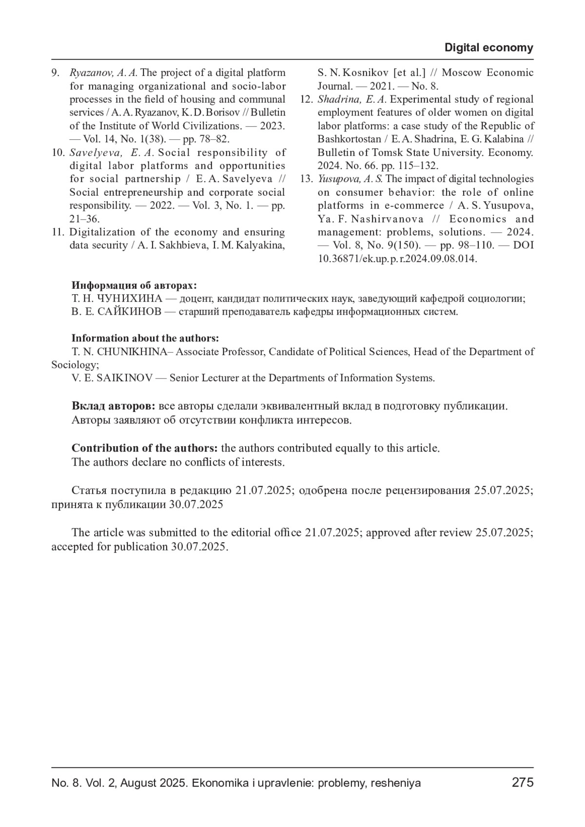 Цифровые платформы являются инструментом преобразования современной экономики и социальной сферы, влияя на организацию коммуникаций, структуру занятости и динамику трудовых отношений.