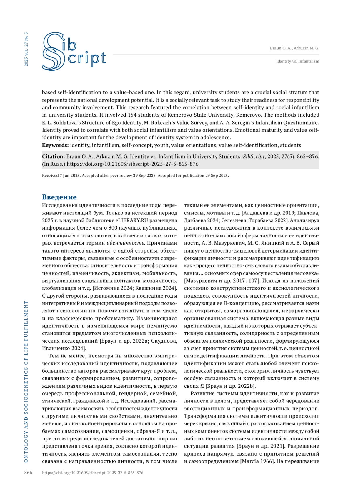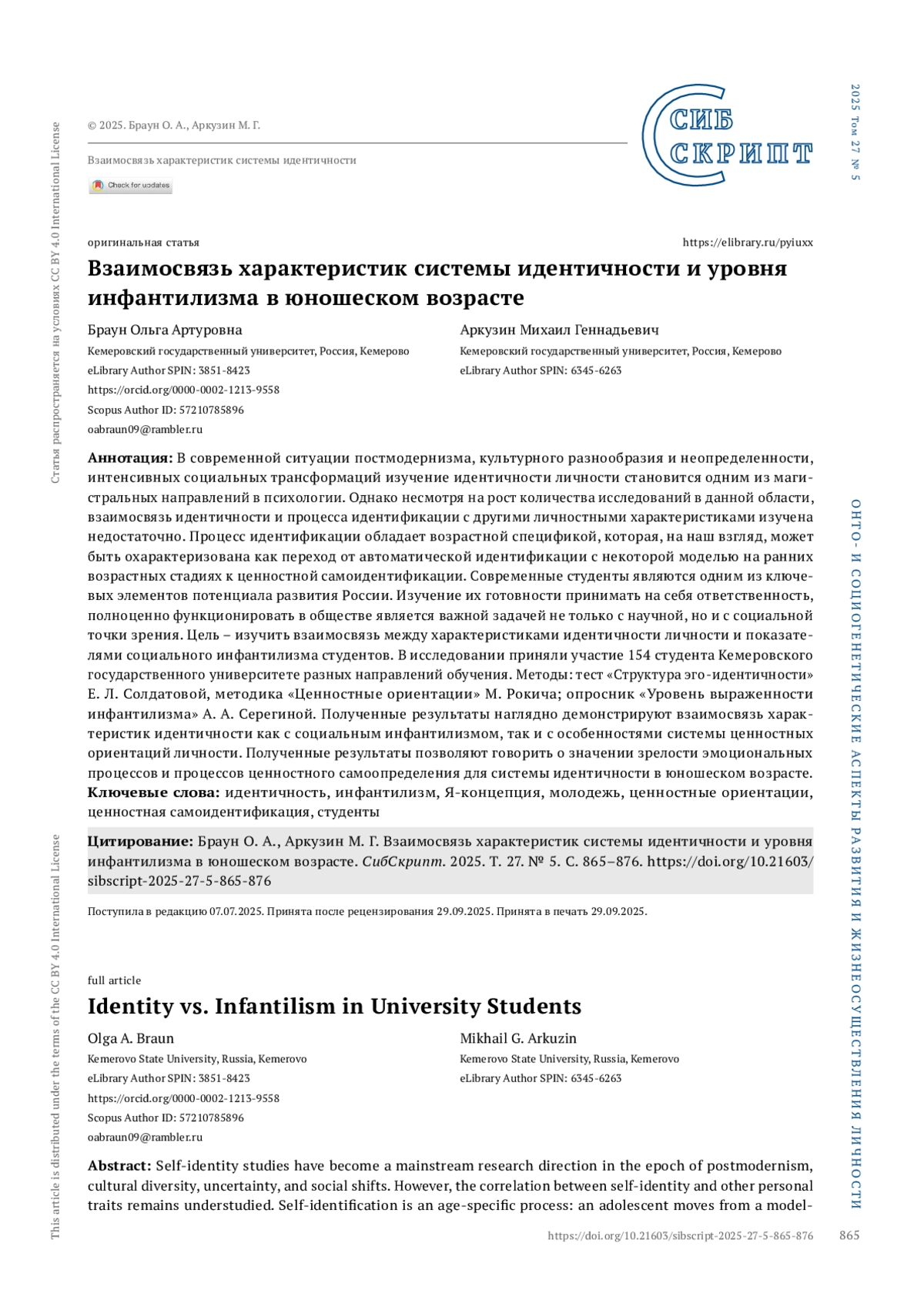 В современной ситуации постмодернизма, культурного разнообразия и неопределенности, интенсивных социальных трансформаций изучение идентичности личности становится одним из магистральных направлений в психологии. Однако несмотря на рост количества исследований в данной области, взаимосвязь идентичности и процесса идентификации с другими личностными характеристиками изучена недостаточно. Процесс идентификации обладает возрастной спецификой, которая, на наш взгляд, может быть охарактеризована как переход от автоматической идентификации с некоторой моделью на ранних возрастных стадиях к ценностной самоидентификации. Современные студенты являются одним из ключевых элементов потенциала развития России. Изучение их готовности принимать на себя ответственность, полноценно функционировать в обществе является важной задачей не только с научной, но и с социальной точки зрения. Цель – изучить взаимосвязь между характеристиками идентичности личности и показателями социального инфантилизма студентов. В исследовании приняли участие 154 студента Кемеровского государственного университете разных направлений обучения. Методы: тест «Структура эго-идентичности» Е. Л. Солдатовой, методика «Ценностные ориентации» М. Рокича; опросник «Уровень выраженности инфантилизма» А. А. Серегиной. Полученные результаты наглядно демонстрируют взаимосвязь характеристик идентичности как с социальным инфантилизмом, так и с особенностями системы ценностных ориентаций личности. Полученные результаты позволяют говорить о значении зрелости эмоциональных процессов и процессов ценностного самоопределения для системы идентичности в юношеском возрасте.