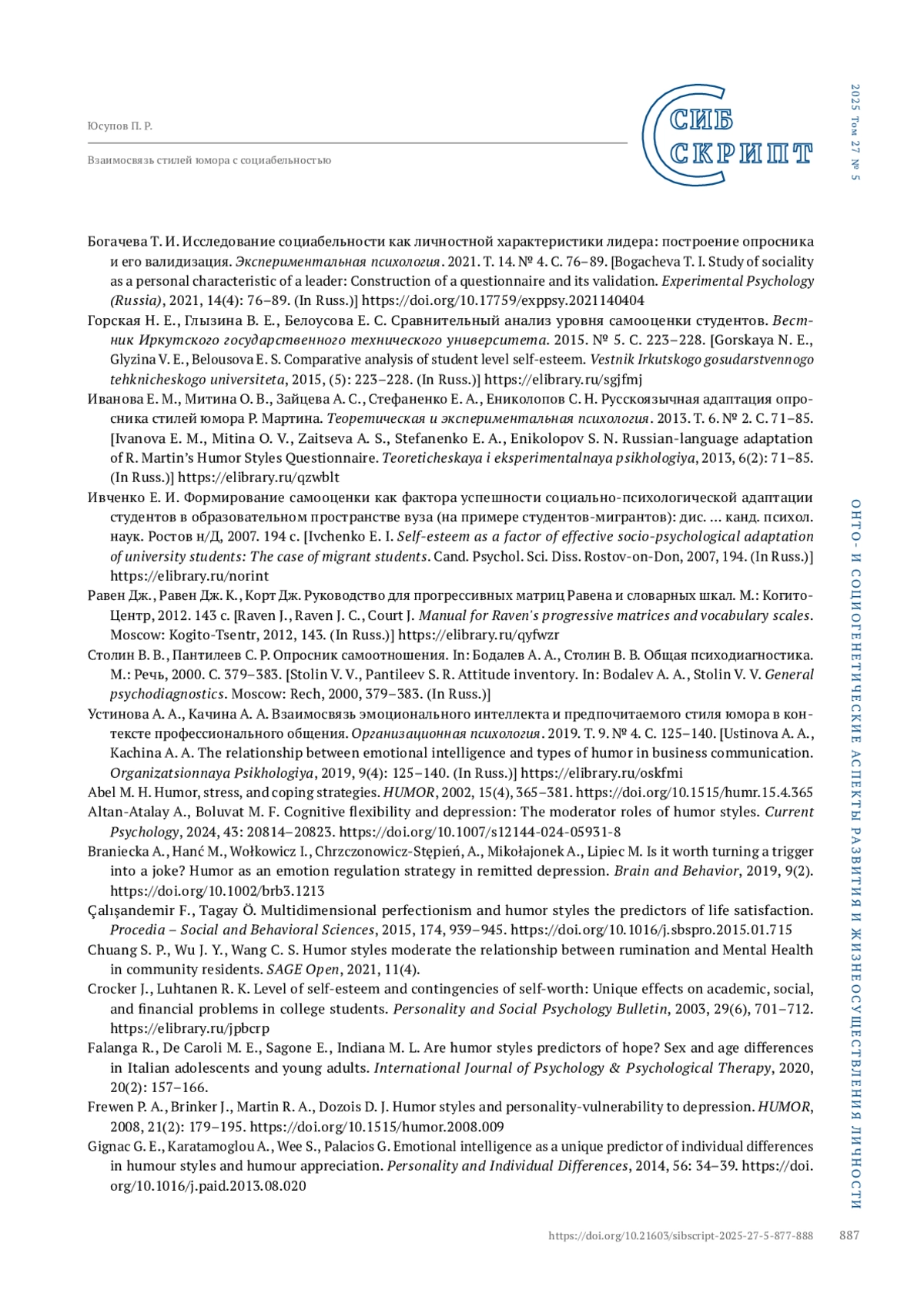 4. Иванова Е. М., Митина О. В., Зайцева А. С., Стефаненко Е. А., Ениколопов С. Н. Русскоязычная адаптация опросника стилей юмора Р. Мартина. Теоретическая и экспериментальная психология. 2013. Т. 6. № 2. С. 71-85. https://elibrary.ru/qzwblt