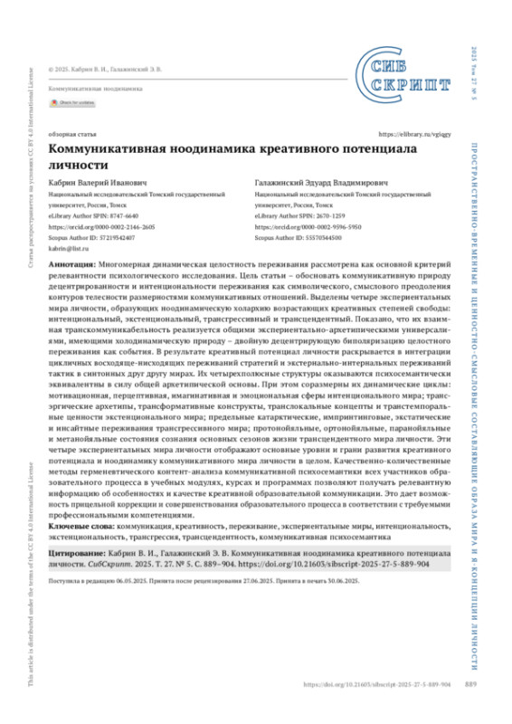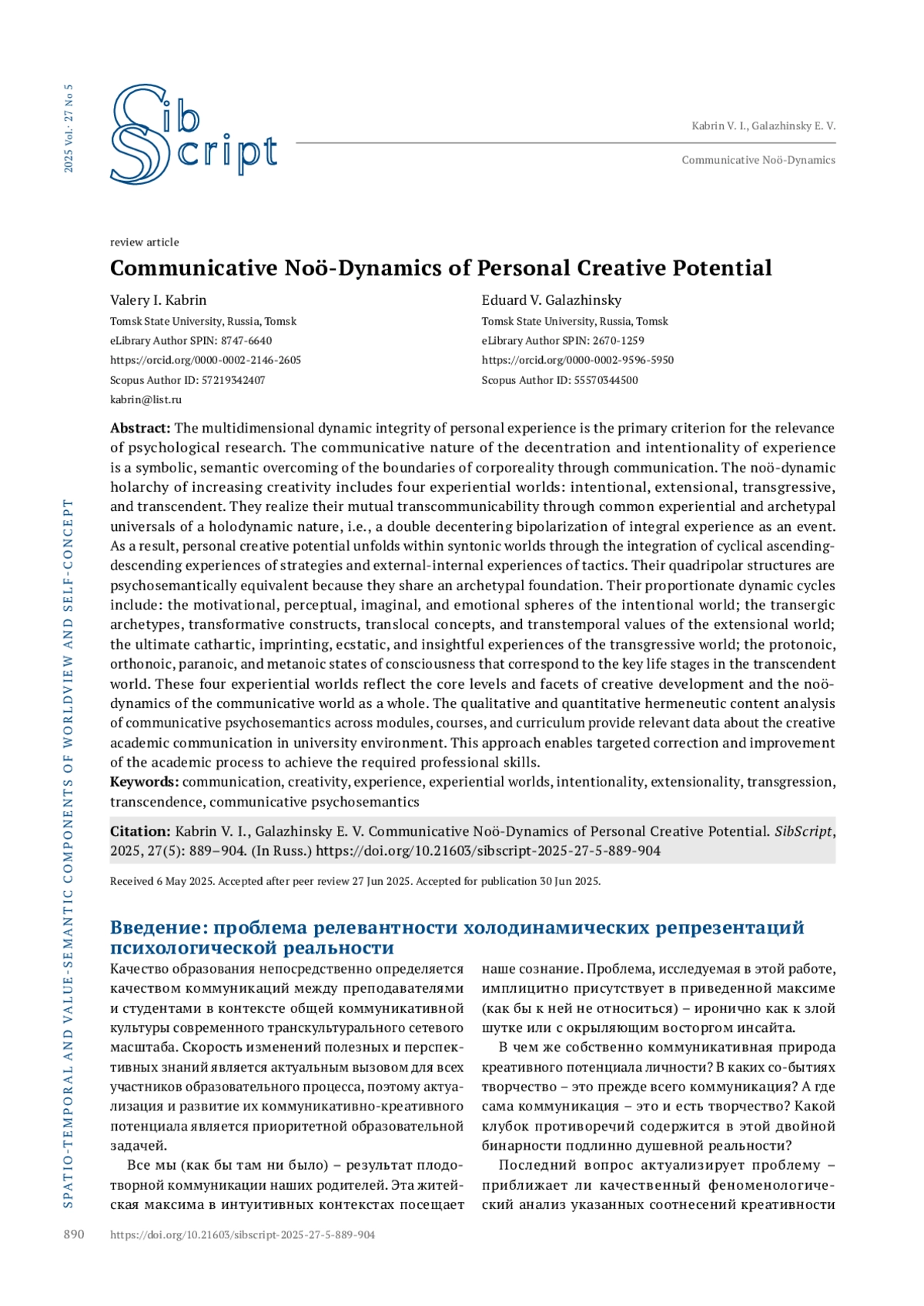 Многомерная динамическая целостность переживания рассмотрена как основной критерий релевантности психологического исследования. Цель статьи – обосновать коммуникативную природу децентрированности и интенциональности переживания как символического, смыслового преодоления контуров телесности размерностями коммуникативных отношений. Выделены четыре экспериентальных мира личности, образующих ноодинамическую холархию возрастающих креативных степеней свободы: интенциональный, экстенциональный, трансгрессивный и трансцендентный. Показано, что их взаимная транскоммуникабельность реализуется общими экспериентально-архетипическими универсалиями, имеющими холодинамическую природу – двойную децентрирующую биполяризацию целостного переживания как события. В результате креативный потенциал личности раскрывается в интеграции цикличных восходяще-нисходящих переживаний стратегий и экстернально-интернальных переживаний тактик в синтонных друг другу мирах. Их четырехполюсные структуры оказываются психосемантически эквивалентны в силу общей архетипической основы. При этом соразмерны их динамические циклы: мотивационная, перцептивная, имагинативная и эмоциональная сферы интенционального мира; трансэргические архетипы, трансформативные конструкты, транслокальные концепты и транстемпоральные ценности экстенционального мира; предельные катарктические, импринтинговые, экстатические и инсайтные переживания трансгрессивного мира; протонойяльные, ортонойяльные, паранойяльные и метанойяльные состояния сознания основных сезонов жизни трансцендентного мира личности. Эти четыре экспериентальных мира личности отображают основные уровни и грани развития креативного потенциала и ноодинамику коммуникативного мира личности в целом. Качественно-количественные методы герменевтического контент-анализа коммуникативной психосемантики всех участников образовательного процесса в учебных модулях, курсах и программах позволяют получать релевантную информацию об особенностях и качестве креативной образовательной коммуникации. Это дает возможность прицельной коррекции и совершенствования образовательного процесса в соответствии с требуемыми профессиональными компетенциями.