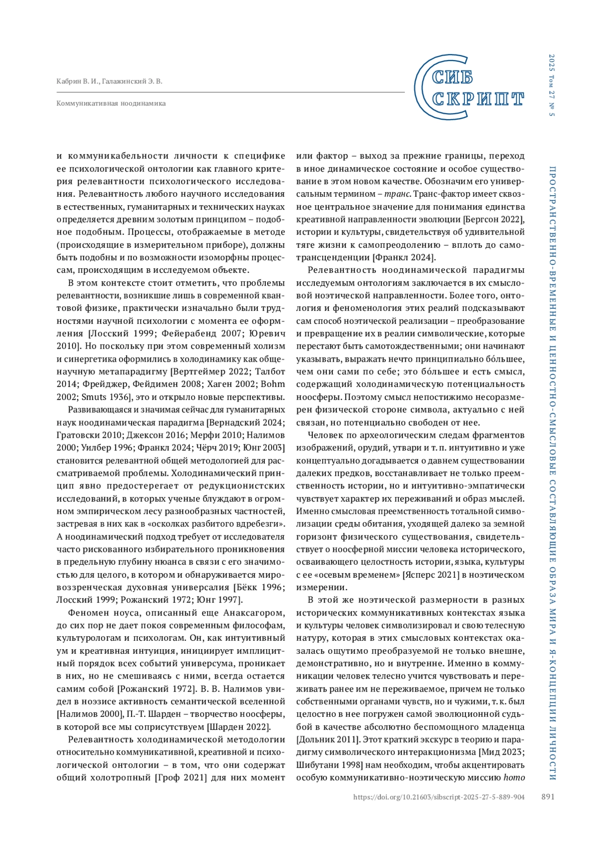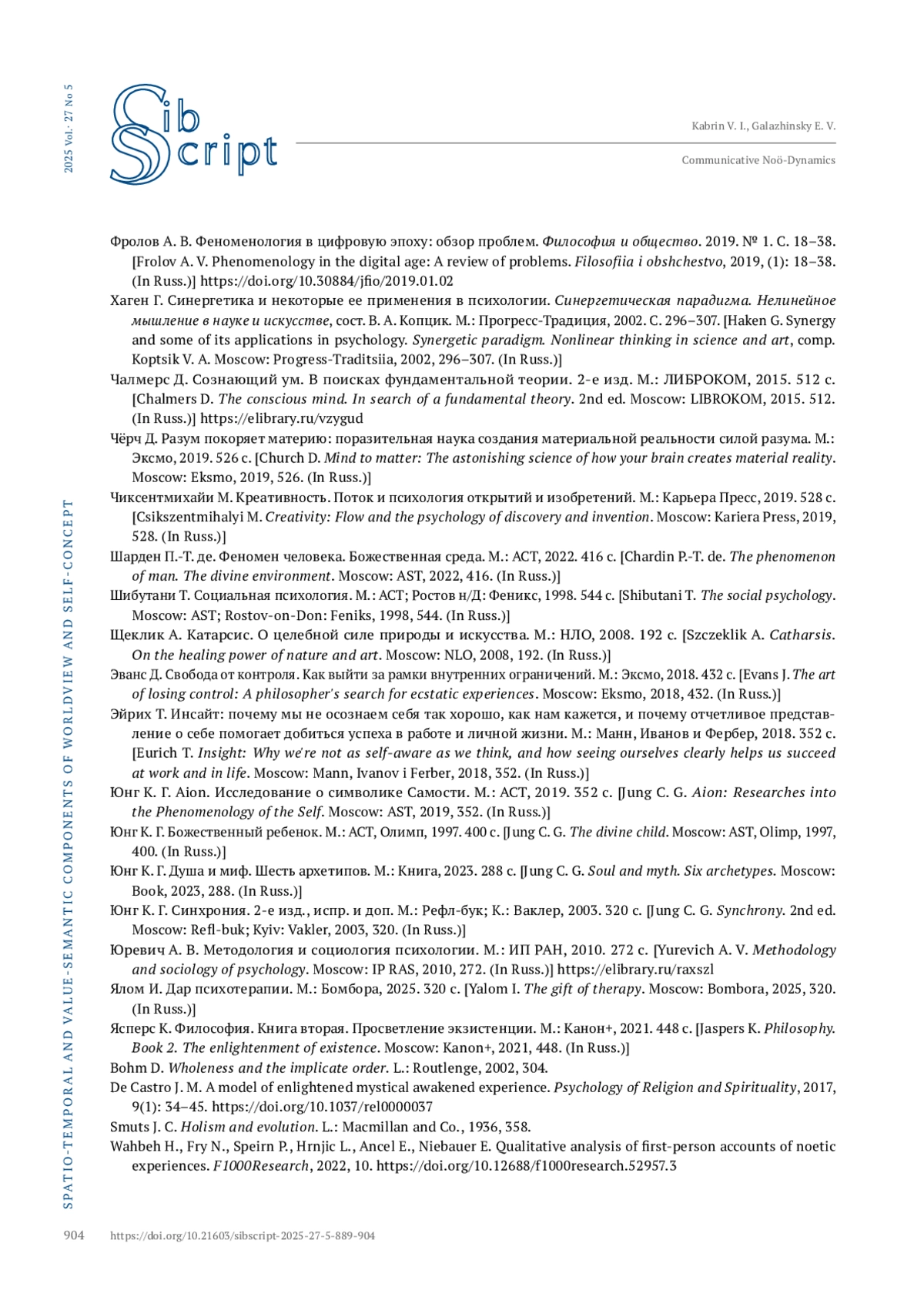 18. Кабрин В. И. Коммуникативная психосемантика когнитивно-ноэтического развития личности. Сибирский психологический журнал. 2022. № 85. С. 51-71. https://doi.org/10.17223/17267080/85/3