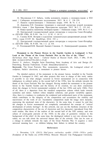 1. Доронина Л.Н. Скульптура сталинской эпохи (1930-1950-е годы): монография. М.: МГПУ, 2013. 97 с. EDN: UGMJUH