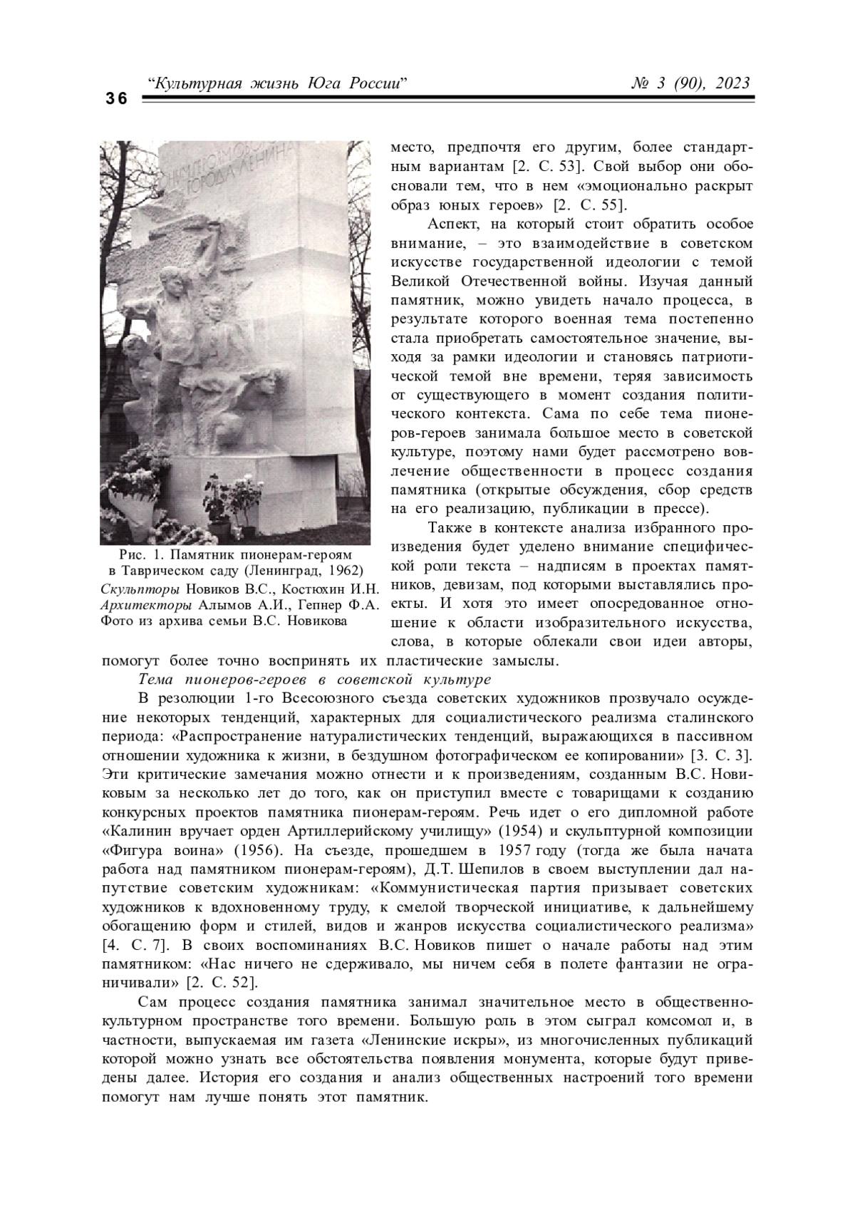 Памятник пионерам-героям, созданный авторским коллективом, который собрал вокруг себя В. С. Новиков, установлен в Таврическом саду в 1962 году (рис. 1). Помимо самого В. С. Новикова, в авторский коллектив вошли его товарищи с учебных лет: скульптор И. Н. Костюхин и архитектор А. И. Алымов, а также архитектор Ф. А. Гепнер, который подключился к работе на завершающем этапе и в конкурсе на памятник не участвовал. Реализованный памятник, как и проекты, конкурировавшие с ним на этапе конкурса, дают возможность проследить эволюцию в советском монументальном искусстве в связи с послаблениями в культурной политике во второй половине 1950-х гг.