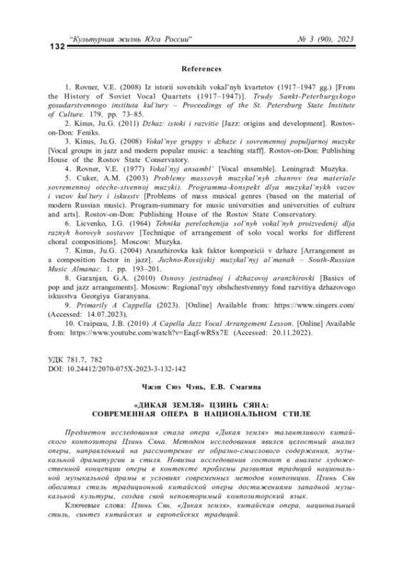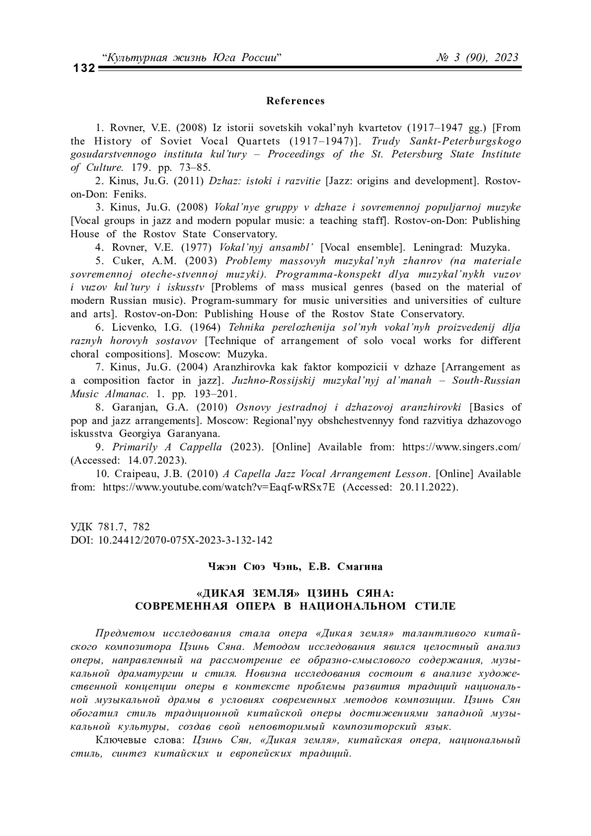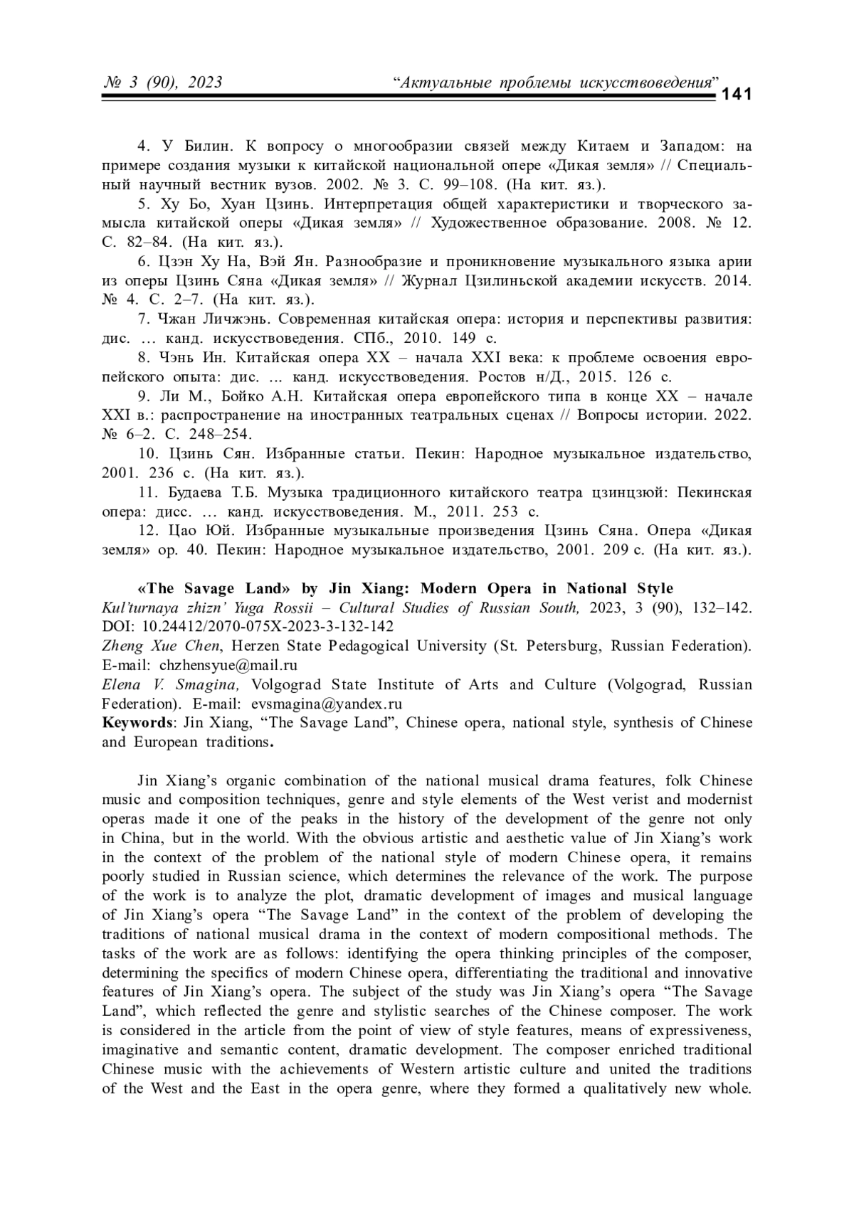 ЧЖЭН С. Ч., СМАГИНА Е. В. "ДИКАЯ ЗЕМЛЯ" ЦЗИНЬ СЯНА: СОВРЕМЕННАЯ ОПЕРА В НАЦИОНАЛЬНОМ СТИЛЕ // КУЛЬТУРНАЯ ЖИЗНЬ ЮГА РОССИИ. 2023. № 3 (90)