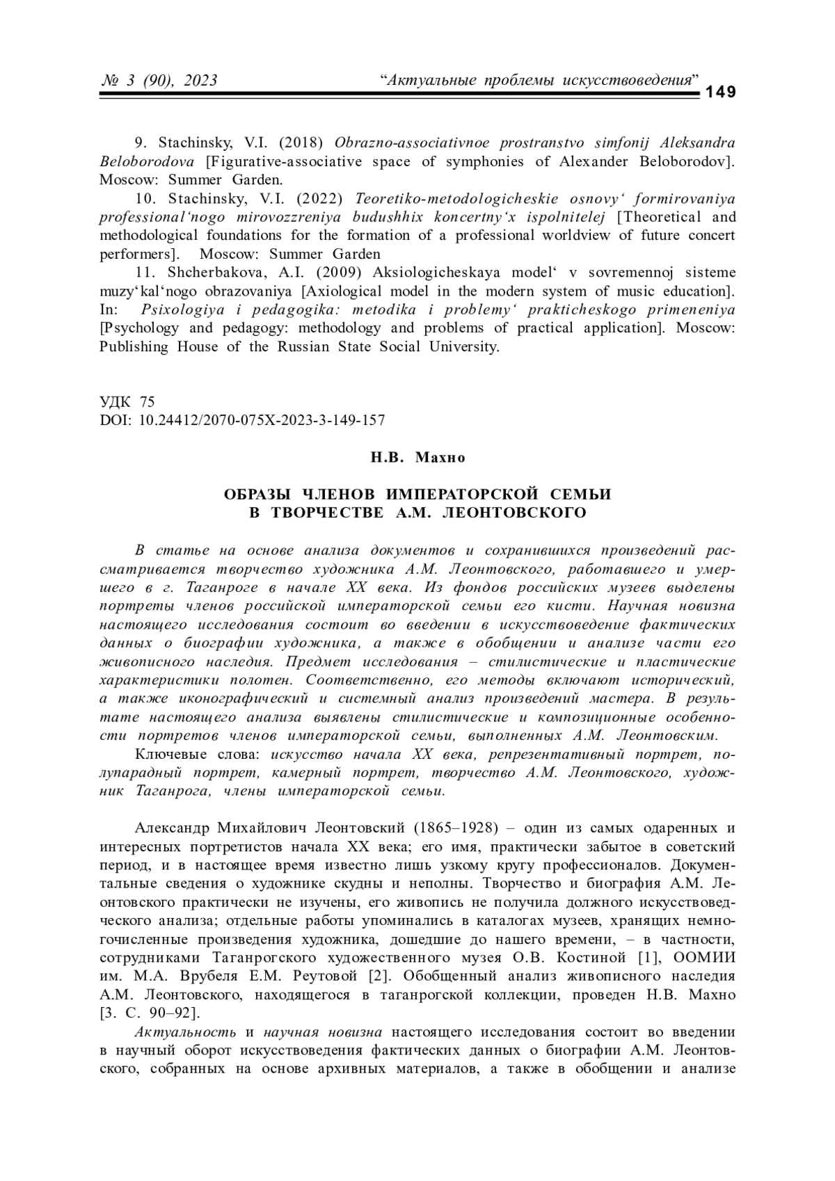 В статье на основе анализа документов и сохранившихся произведений рассматривается творчество художника А. М. Леонтовского, работавшего и умершего в г. Таганроге в начале ХХ века. Из фондов российских музеев выделены портреты членов российской императорской семьи его кисти. Научная новизна настоящего исследования состоит во введении в искусствоведение фактических данных о биографии художника, а также в обобщении и анализе части его живописного наследия. Предмет исследования – стилистические и пластические характеристики полотен. Соответственно, его методы включают исторический, а также иконографический и системный анализ произведений мастера. В результате настоящего анализа выявлены стилистические и композиционные особенности портретов членов императорской семьи, выполненных А. М. Леонтовским