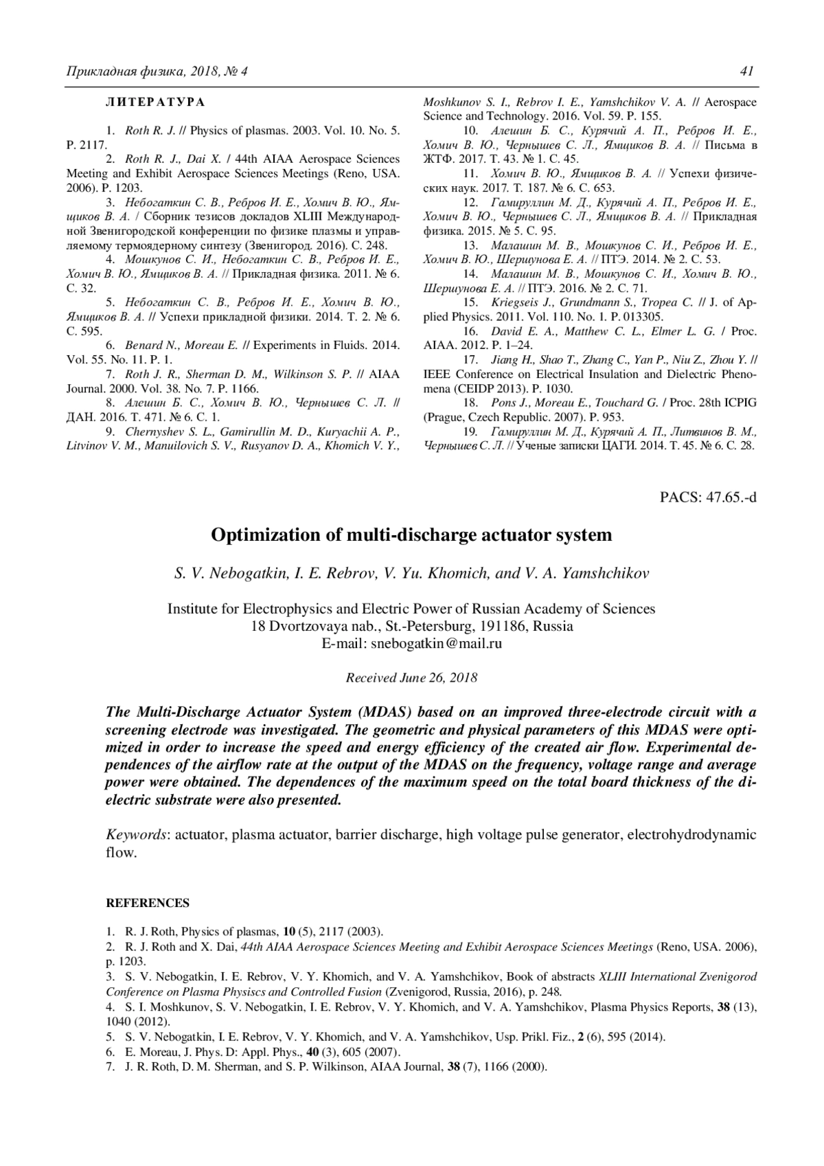 6. E. Moreau, J. Phys. D: Appl. Phys., 40 (3), 605 (2007).