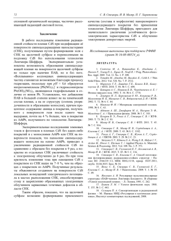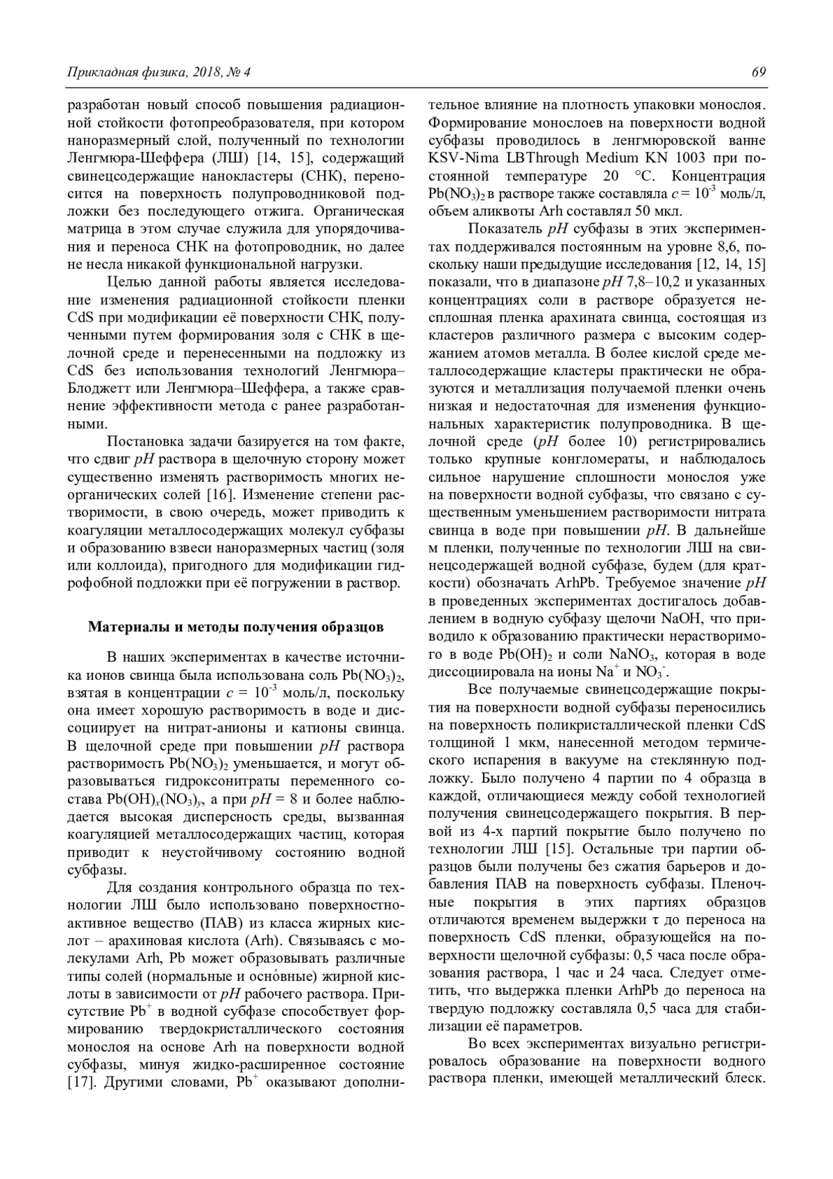 Таким образом, показано, что на щелочной субфазе возможно формирование приемлемого качества (состава и морфологии) наноразмерного свинецсодержащего покрытия без применения технологии Ленгмюра–Шеффера, пригодного для значительного увеличения устойчивости фотоэлектрических характеристик CdS к облучению электронами допороговых энергий.