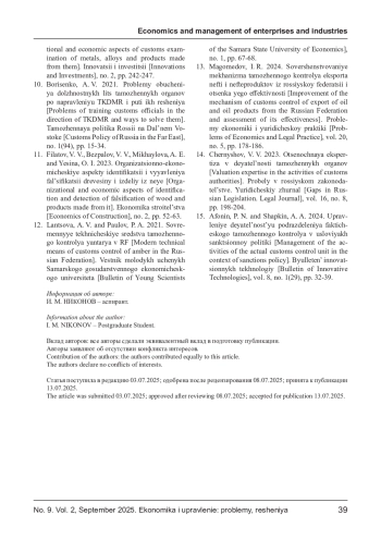 9. Филатов В. В., Безпалов В. В., Крыгина И. Е., Мариен Л. С. Организационно-экономические аспекты таможенной экспертизы металлов, сплавов и изделий из них // Инновации и инвестиции. 2023. № 2. С. 242-247. EDN: JRQRFQ
