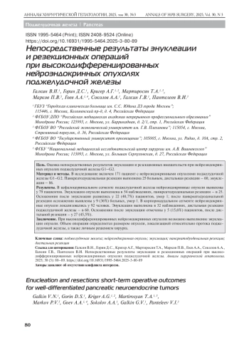 Цель. Оценка непосредственных результатов энуклеации и резекционных вмешательств при нейроэндокринных опухолях поджелудочной железы G1–G2.