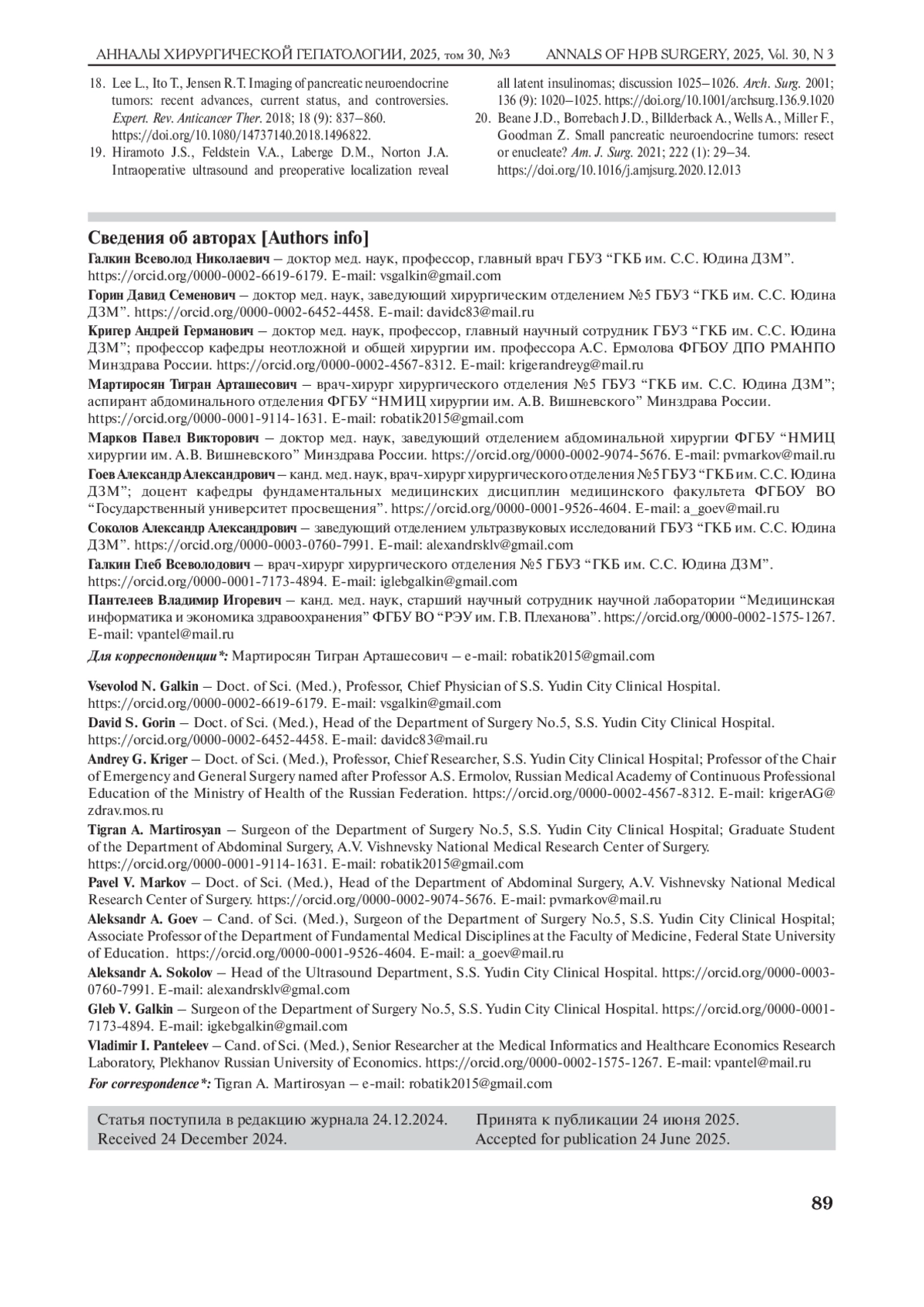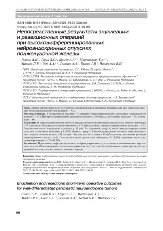 5. Солодкий В.А., Кригер А.Г., Ахаладзе Г.Г., Гоев А.А., Гончаров С.В., Горин Д.С., Загайнов В.Е., Кузнецов Н.С., Кучин Д. М., Латкина Н.В., Лысанюк М. В., Майстренко Н.А., Мартиросян Т.А., Ромащенко П.Н., Шуинова Е.А., Юкина М.Ю. Энуклеация опухолей поджелудочной железы (многоцентровое исследование). Хирургия. Журнал им. Н.И. Пирогова. 2023; 2: 13-20.