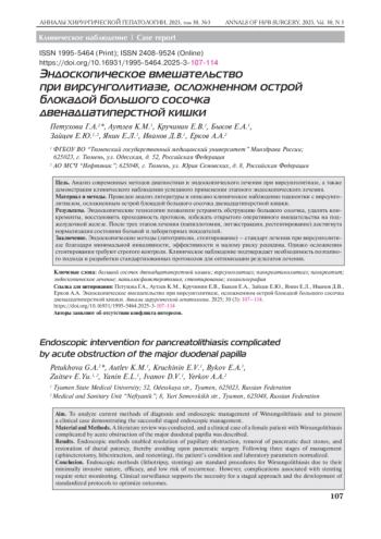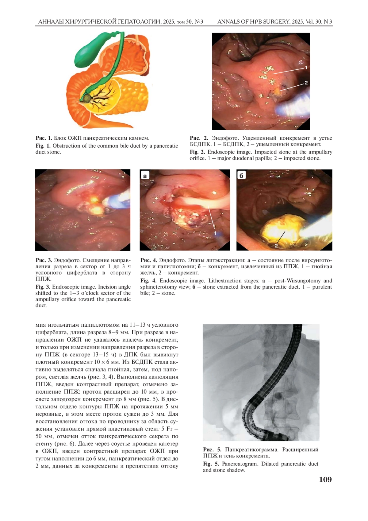 Результаты. Эндоскопические технологии позволили устранить обструкцию большого сосочка, удалить конкременты, восстановить проходимость протоков, избежать открытого оперативного вмешательства на поджелудочной железе. После трех этапов лечения (папиллотомия, литэкстракция, рестентирование) достигнута нормализация состояния больной и лабораторных показателей.