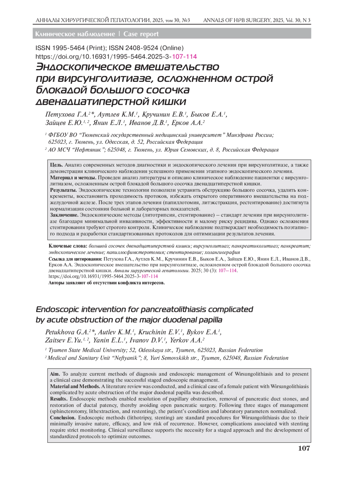 Вирсунголитиаз – редкое, но клинически значимое патологическое состояние, связанное с хроническим панкреатитом. Формирование камней в протоке поджелудочной железы (ППЖ) сопровождается выраженными функциональными нарушениями – болевым синдромом, нарушением пищеварения, а также ухудшением качества жизни пациентов.