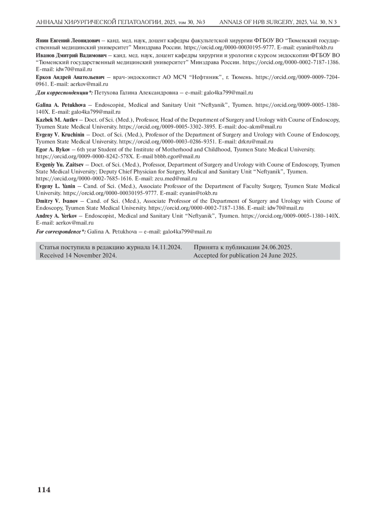 Petukhova G.A., Аutlev K.M., Vorobyeva E.A., Smolin A. V., Kruchinin E.V., Chakhchakhov Ya.A., Ivanova E.N., Ivanov D.V. Difficulties in verifying the cause of iatrogenic stricture of hepaticocholedoch. The role of morphology in diagnosis. Medical Science and Education of Urals. 2023; 24 (3) (115): 165-170. (In Russian).