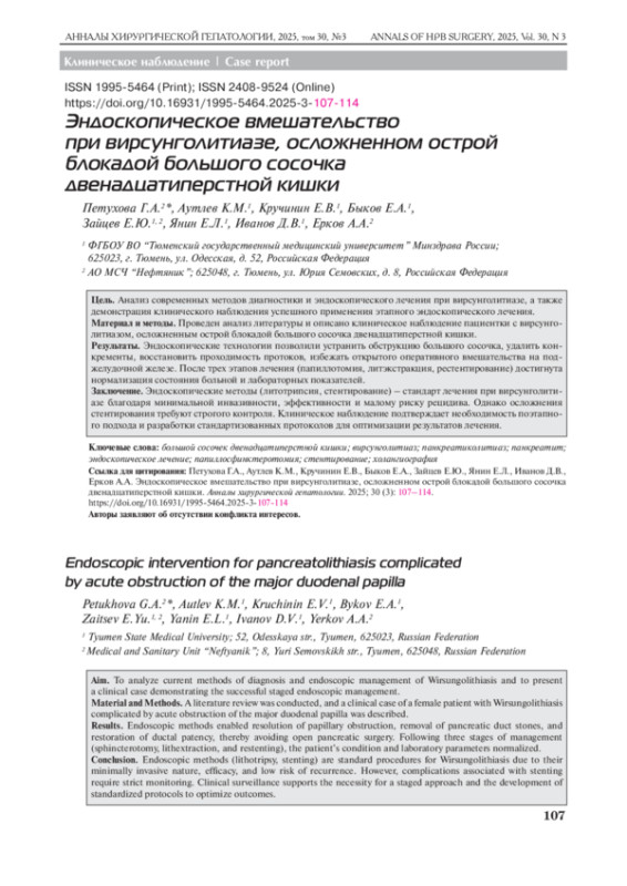Заключение. Эндоскопические методы (литотрипсия, стентирование) – стандарт лечения при вирсунголитиазе благодаря минимальной инвазивности, эффективности и малому риску рецидива. Однако осложнения стентирования требуют строгого контроля. Клиническое наблюдение подтверждает необходимость поэтапного подхода и разработки стандартизованных протоколов для оптимизации результатов лечения.
