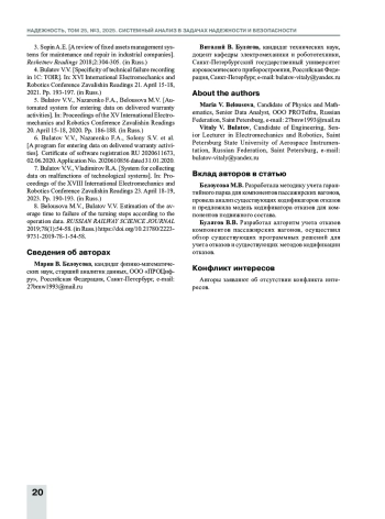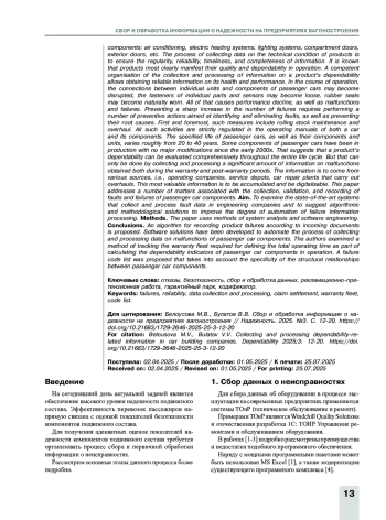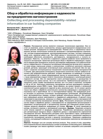 Выводы. Предложен алгоритм учета отказов изделий по входящим документам. Разработаны программные решения для автоматизации процесса сбора и обработки данных о неисправностях компонентов пассажирских вагонов. Рассмотрена методика учета гарантийного парка, необходимого для формирования суммарной наработки в процессе расчета показателей надежности компонентов пассажирских вагонов в процессе эксплуатации. Предложен кодификатор отказов, учитывающий особенности структурной взаимосвязи компонентов пассажирских вагонов.