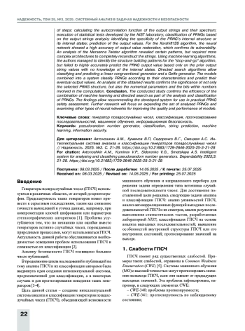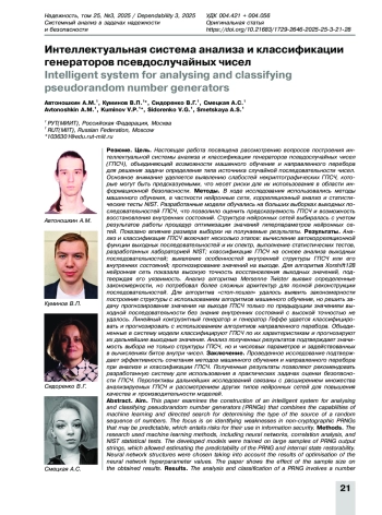 АВТОНОШКИН А. М., КУМИНОВ В. П., СИДОРЕНКО В. Г., СМЕЦКАЯ А. С. ИНТЕЛЛЕКТУАЛЬНАЯ СИСТЕМА АНАЛИЗА И КЛАССИФИКАЦИИ ГЕНЕРАТОРОВ ПСЕВДОСЛУЧАЙНЫХ ЧИСЕЛ // НАДЕЖНОСТЬ. 2025. ТОМ 25, № 3