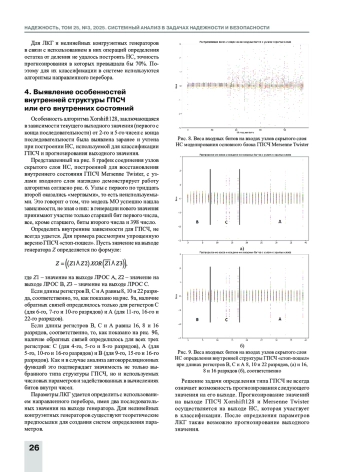 Результаты. Анализ и классификация ГПСЧ включает несколько этапов: вычисление автокорреляционной функции выходных последовательностей и их спектр, выполнение статистических тестов, разработанных лабораторией NIST; классификация ГПСЧ на основе анализа выходных последовательностей; выявление особенностей внутренней структуры ГПСЧ или его внутренних состояний; прогнозирование значений на выходе. Для алгоритма Xorshift128 нейронная сеть показала высокую точность восстановления выходных значений, подтверждая его уязвимость. Анализ алгоритма Mersenne Twister выявил определенные закономерности, но потребовал более сложных архитектур для полной реконструкции последовательностей. Для алгоритма «стоп-пошел» удалось выявить закономерности построения структуры с использованием алгоритмов машинного обучения, но решить задачу прогнозирования значения на выходе ГПСЧ только по предыдущим значениям выходной последовательности без знания внутренних состояний с высокой точностью не удалось. Линейный конгруэнтный генератор и генератор Геффе удается классифицировать и прогнозировать с использованием алгоритмов направленного перебора. Объединенные в систему модели классифицируют ГПСЧ по их характеристикам и прогнозируют их дальнейшие выходные значения. Анализ полученных результатов подтверждает значимость выбора не только структуры ГПСЧ, но и числовых параметров и задействованных в вычислениях битов внутри чисел.