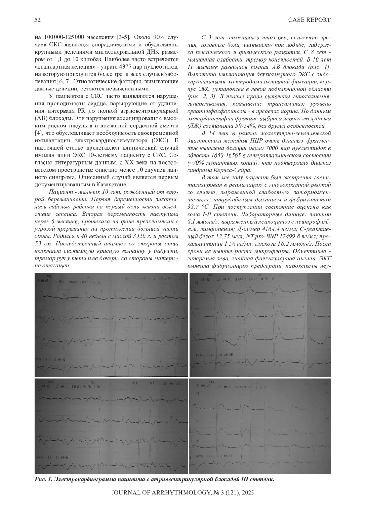 Синдром Кернса-Сейра (СКС) представляет собой редкую митохондриальную патологию, впервые описанную в 1958 году Томасом Кернсом и Джорджем Помероя Сейром в публикации «Пигментный ретинит, наружная офтальмоплегия и полная блокада сердца» [1]. Заболевание характеризуется классической триадой симптомов: дебют до 20 лет, хроническая прогрессирующая наружная офтальмоплегия и пигментная ретинопатия [2]. Существенной особенностью СКС является высокая частота нарушений проводящей системы сердца, что значительно влияет на прогноз заболевания.