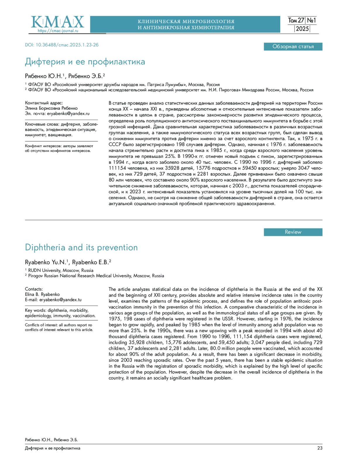В статье проведен анализ статистических данных заболеваемости дифтерией на территории России конца ХХ – начала ХХI в., приведены абсолютные и относительные интенсивные показатели заболеваемости в целом в стране, рассмотрены закономерности развития эпидемического процесса, определена роль популяционного антитоксического поствакцинального иммунитета в борьбе с этой грозной инфекцией. Дана сравнительная характеристика заболеваемости в различных возрастных группах населения, а также иммунологического статуса всех возрастных групп, был сделан вывод о снижении иммунитета против дифтерии именно за счет взрослого контингента. Так, к 1975 г. в СССР было зарегистрировано 198 случаев дифтерии. Однако, начиная с 1976 г. заболеваемость начала стремительно расти и достигла пика к 1985 г., когда среди взрослого населения уровень иммунитета не превышал 25%. В 1990-х гг. отмечен новый подъем с пиком, зарегистрированным в 1994 г., когда всего заболело около 40 тыс. человек. С 1990 по 1996 г. дифтерией заболело 111154 человека, из них 35928 детей, 15776 подростков и 59450 взрослых; умерло 3047 человек, из них 729 детей, 37 подростков и 2281 взрослых. Далее прививками было охвачено свыше 80 млн человек, что составило около 90% взрослого населения. В результате было достигнуто значительное снижение заболеваемости, которая, начиная с 2003 г., достигла показателей спорадической, и к 2023 г. интенсивный показатель установился на уровне тысячных долей на 100 тыс. населения. Однако, не смотря на снижение общей заболеваемости дифтерией в стране, она остается актуальной социально-значимой проблемой практического здравоохранения.