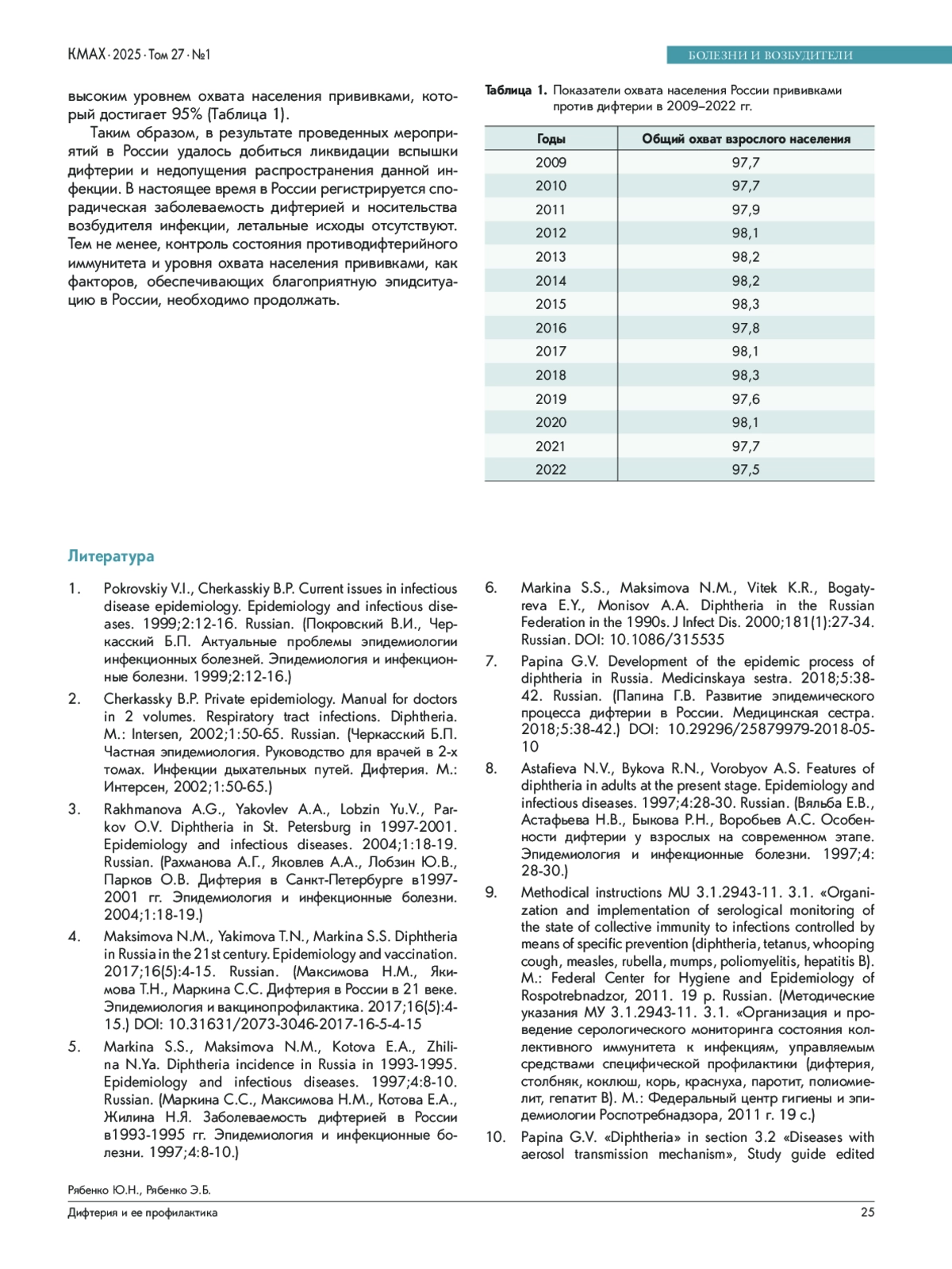 8. Вяльба Е.В., Астафьева Н.В., Быкова Р.Н., Воробьев А.С. Особенности дифтерии у взрослых на современном этапе. Эпидемиология и инфекционные болезни. 1997;4: 28-30.).