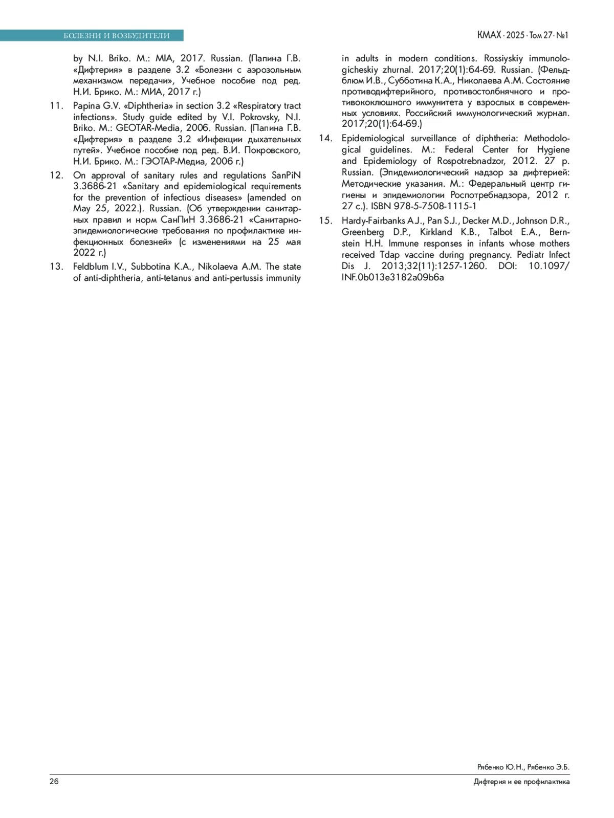 13. Фельдблюм И.В., Субботина К.А., Николаева А.М. Состояние противодифтерийного, противостолбнячного и противококлюшного иммунитета у взрослых в современных условиях. Российский иммунологический журнал. 2017;20(1):64-69.).