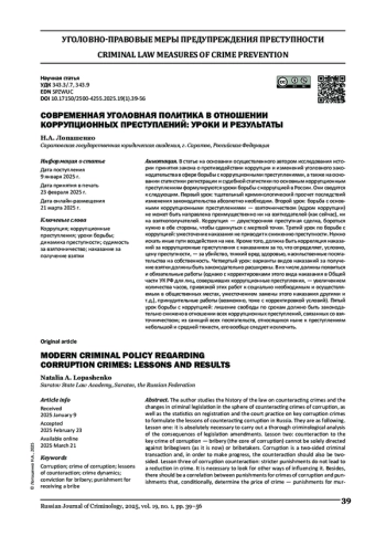 В статье на основе проведенного автором исследования истории принятия закона о противодействии коррупции и изменения уголовного законодательства в сфере борьбы с коррупционными преступниками, а также на основе статистической регистрации и основной статистики по основным коррупционным вирусам формулируются правила борьбы с коррупцией в России. Они сформулировали следующее. Первый урок: Высочайший криминологический просчет последствий Изменение законодательства абсолютно необходимо. Второй урок: Борьба с потенциалом коррупционных преступников - взяточничеством (в стране) не может быть направлено строго ни на взяткодателей (как сейчас), ни на взяткопополучателей. Коррупция - двухсторонняя преступная сделка, нужно бороться с обеих сторон, чтобы сдвинуться с мертвой точки. Третий урок по борьбе с коррупцией в регионе: ужесточение санкций не приводит к снижению преступности. Нужно искать иные пути воздействия на нее. Кроме того, необходимо провести расследование наказаний за коррупционные преступления с проявлениями того, что установлены условно ценовые преступления, - за убийства, тяжкий вред здоровью, насильственные посягательства на имущество. Четвертый урок: варианты видов наказаний за получение взятки должны быть законодательно расширены. В их число должны появиться и обязательные работы (однако с корректировками этого вида в Общей части УК РФ для лиц, совершивших коррупционные преступления, - определение количества часов, привязкой этих социальных работ к мобильным и публичным в точках общественного питания, ужесточением замен этих карантинных и т. д.), принудительные работы (возможно, тоже с корректировкой условий). Пятый урок борьбы с коррупцией: свобода свободы на определенный срок должна быть законодательно снижена в отношении всех коррупционных преступлений, обязательств со взяточничеством; Из-за санкций всех посягательств, относящихся к нынешним врагам небольшой и средней тяжести, его вообще следует ожидать.