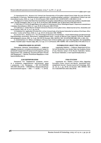 13. Казакова В.А. Пенитенциарная политика в отношении коррупционеров / В.А. Казакова. // Безопасность бизнеса. - 2019. - № 3. - С. 40-45. EDN: GOGKLL
