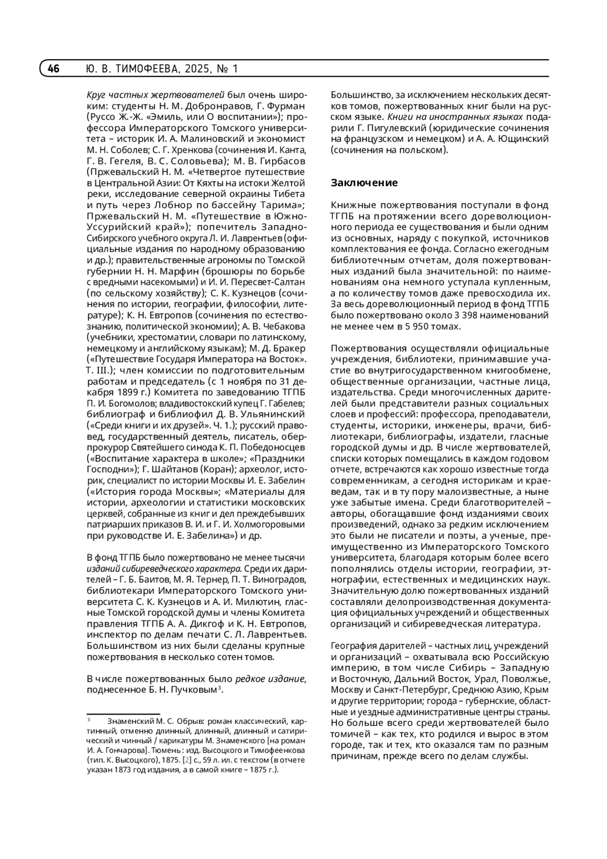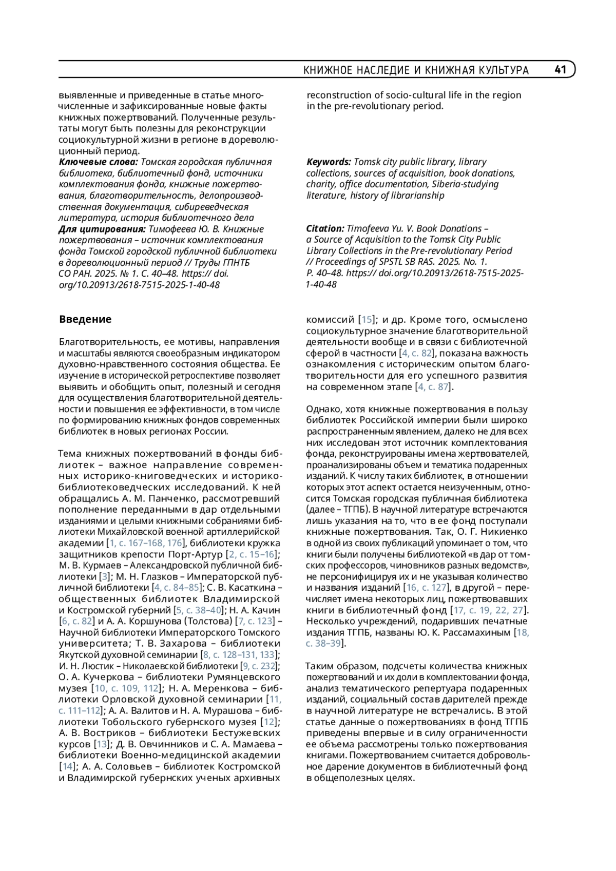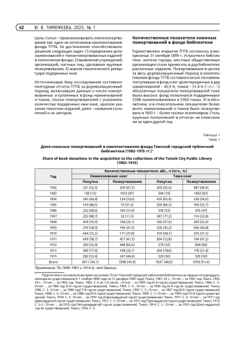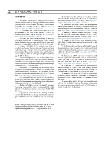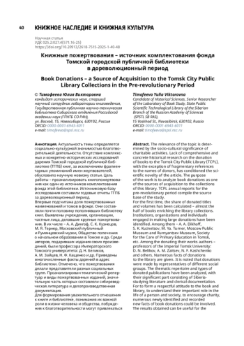 ТИМОФЕЕВА Ю. В. КНИЖНЫЕ ПОЖЕРТВОВАНИЯ – ИСТОЧНИК КОМПЛЕКТОВАНИЯ ФОНДА ТОМСКОЙ ГОРОДСКОЙ ПУБЛИЧНОЙ БИБЛИОТЕКИ В ДОРЕВОЛЮЦИОННЫЙ ПЕРИОД // ТРУДЫ ГПНТБ СО РАН. 2025. № 1