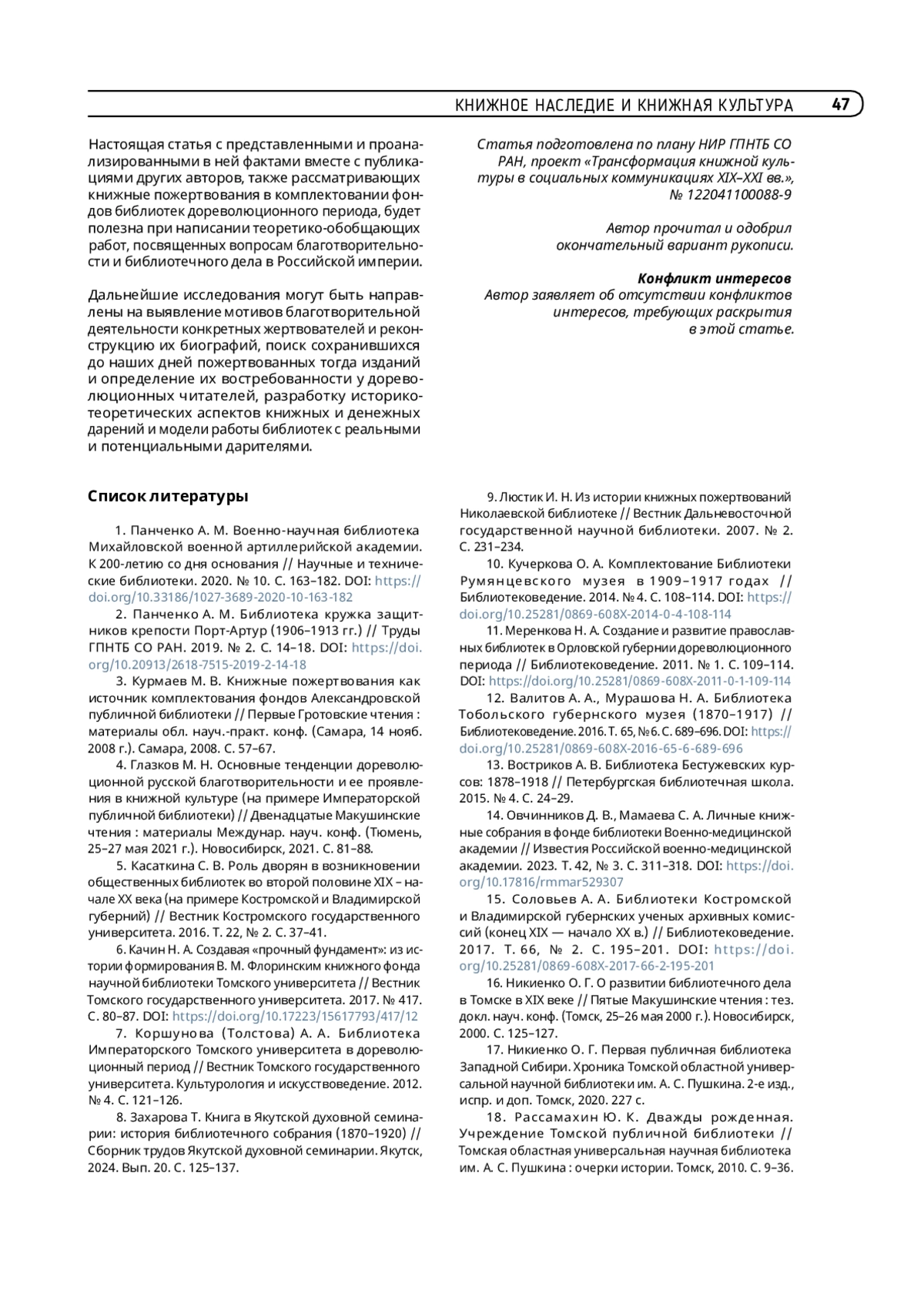Статья: Книжные пожертвования – источник комплектования фонда Томской городской публичной библиотеки в дореволюционный период (2025)
