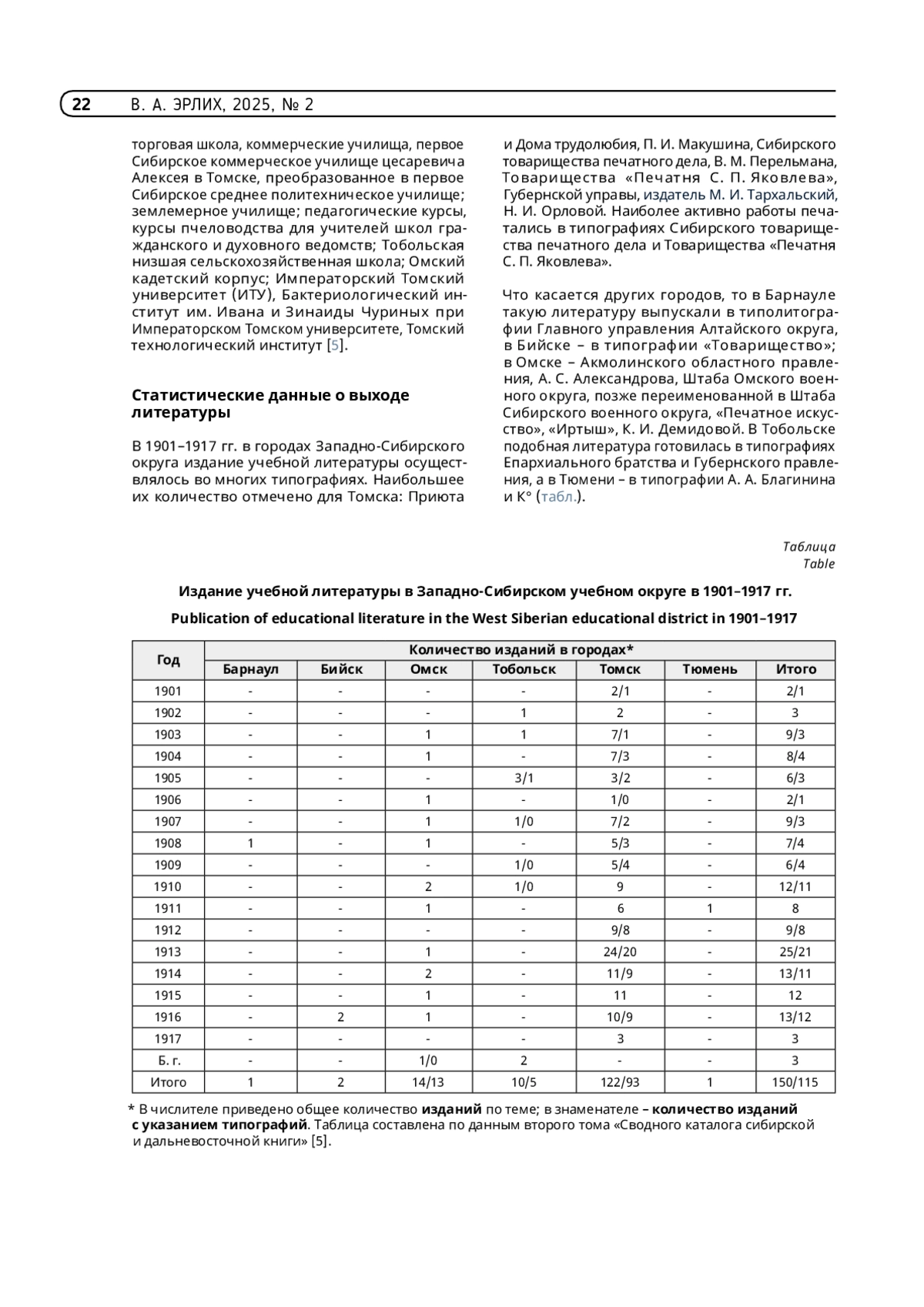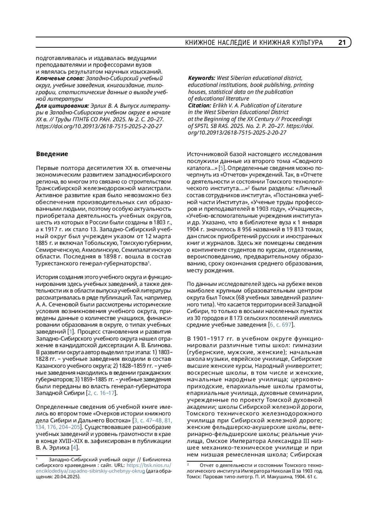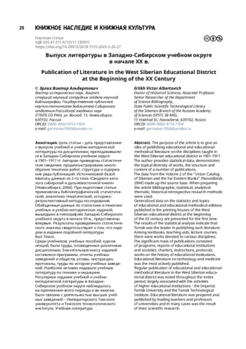 4. Эрлих В. А. Издание учебной и учебно-методической литературы в Сибири в конце XVIII-XIX в. // Труды ГПНТБ СО РАН. 2023. № 4. С. 21-31. https://doi.org/10.20913/2618-7515-2023-4-21-31