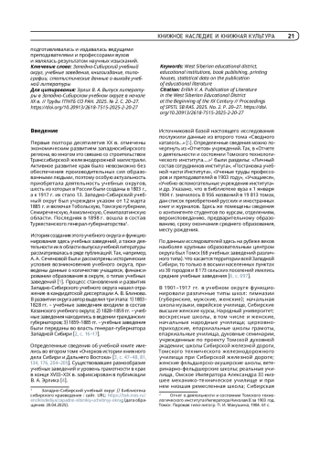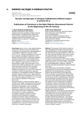 Обобщенные данные по статистике и тематике учебных и учебно-методических изданий, вышедших в типографиях Западно-Сибирского учебного округа в начале XX в., представлены впервые. Результаты проведенного статистического анализа свидетельствуют о том, что лидером в издании подобной литературы был Томск.