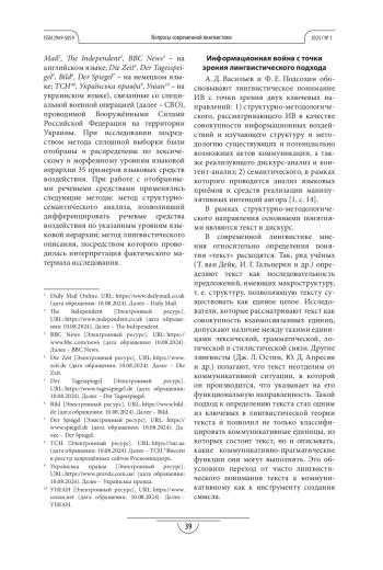 1. Васильев А. Д., Подсохин Ф. Е. Информационная война: лингвистический аспект // Политическая лингвистика. 2016. № 2. С. 10-16. EDN: WDNOUH